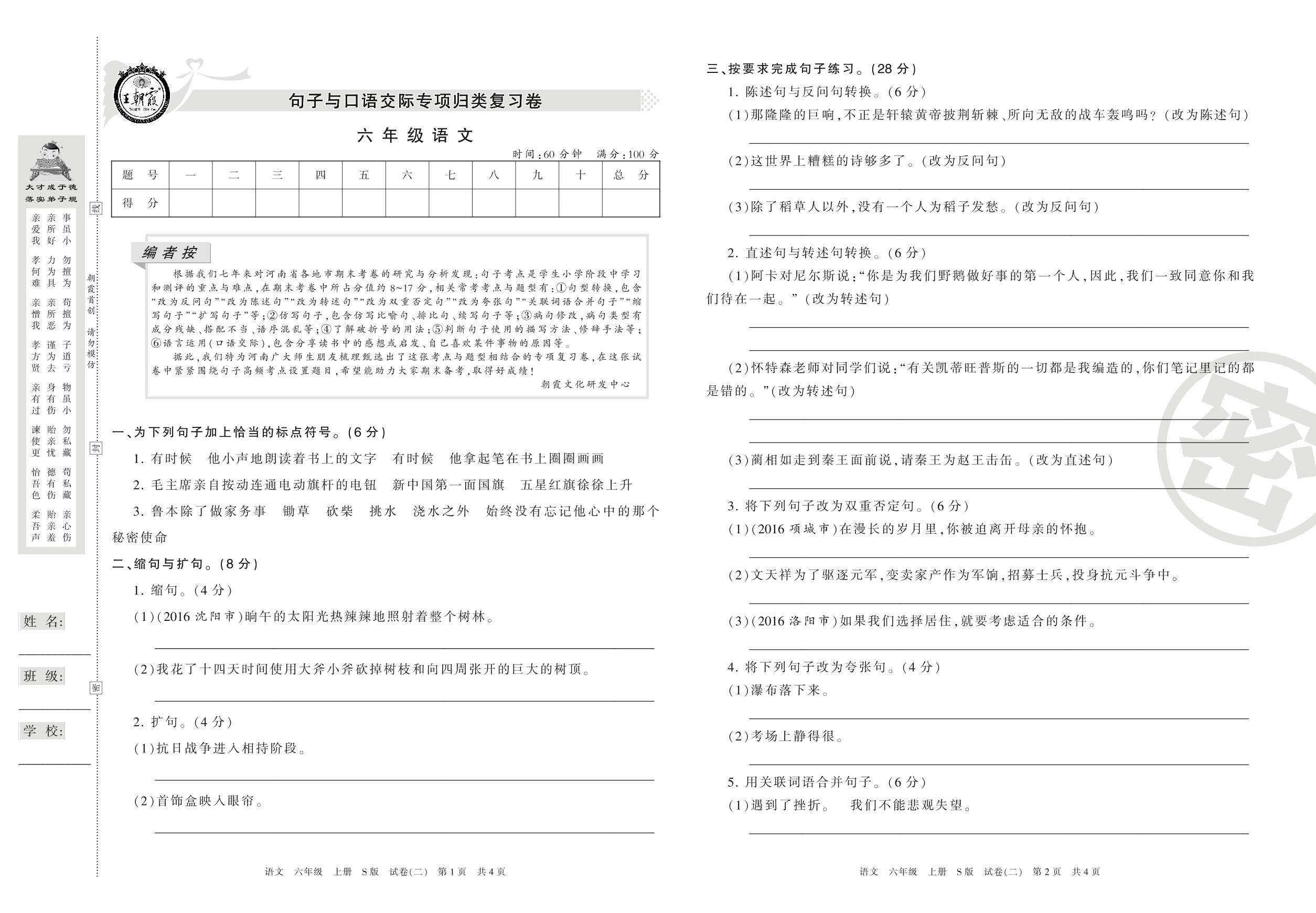 王朝霞期末专项卷六年级上册语文(S版)_R210802110019【2】