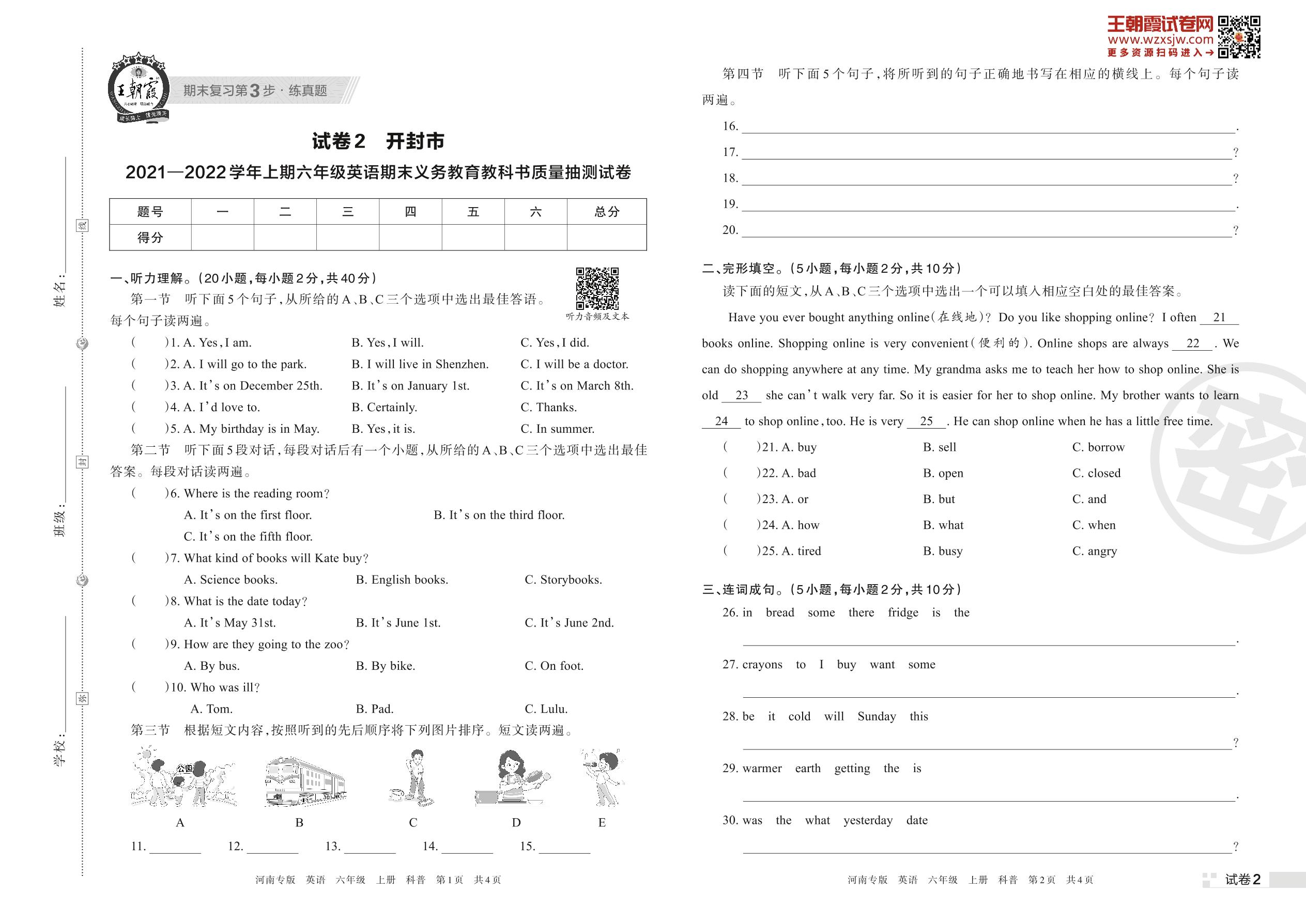 开封市2021—2022学年上期六年级英语期末义务教育教科书质量抽测试卷(科普版)【2】