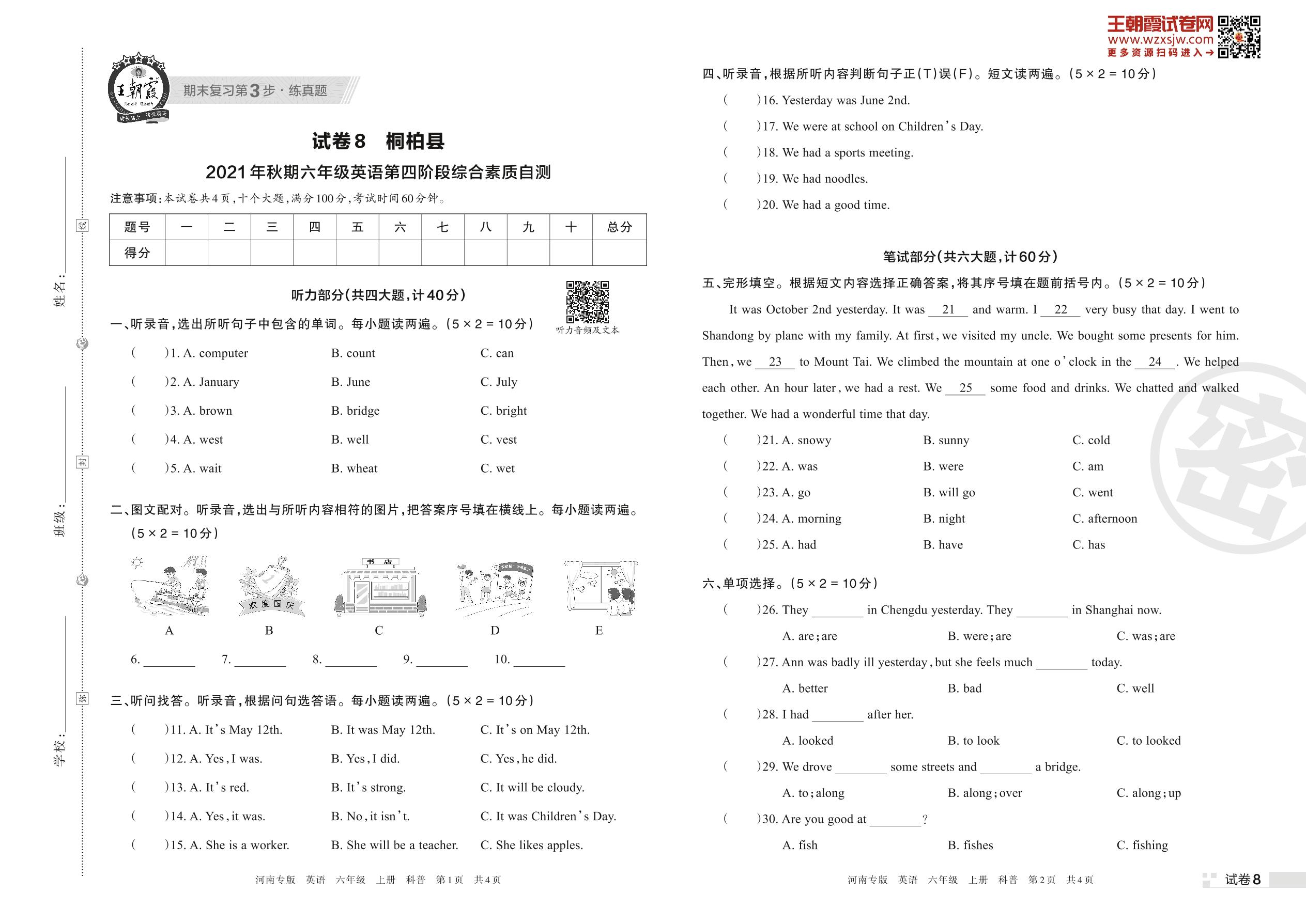 桐柏县2021年秋期六年级英语第四阶段综合素质自测(科普版)【8】