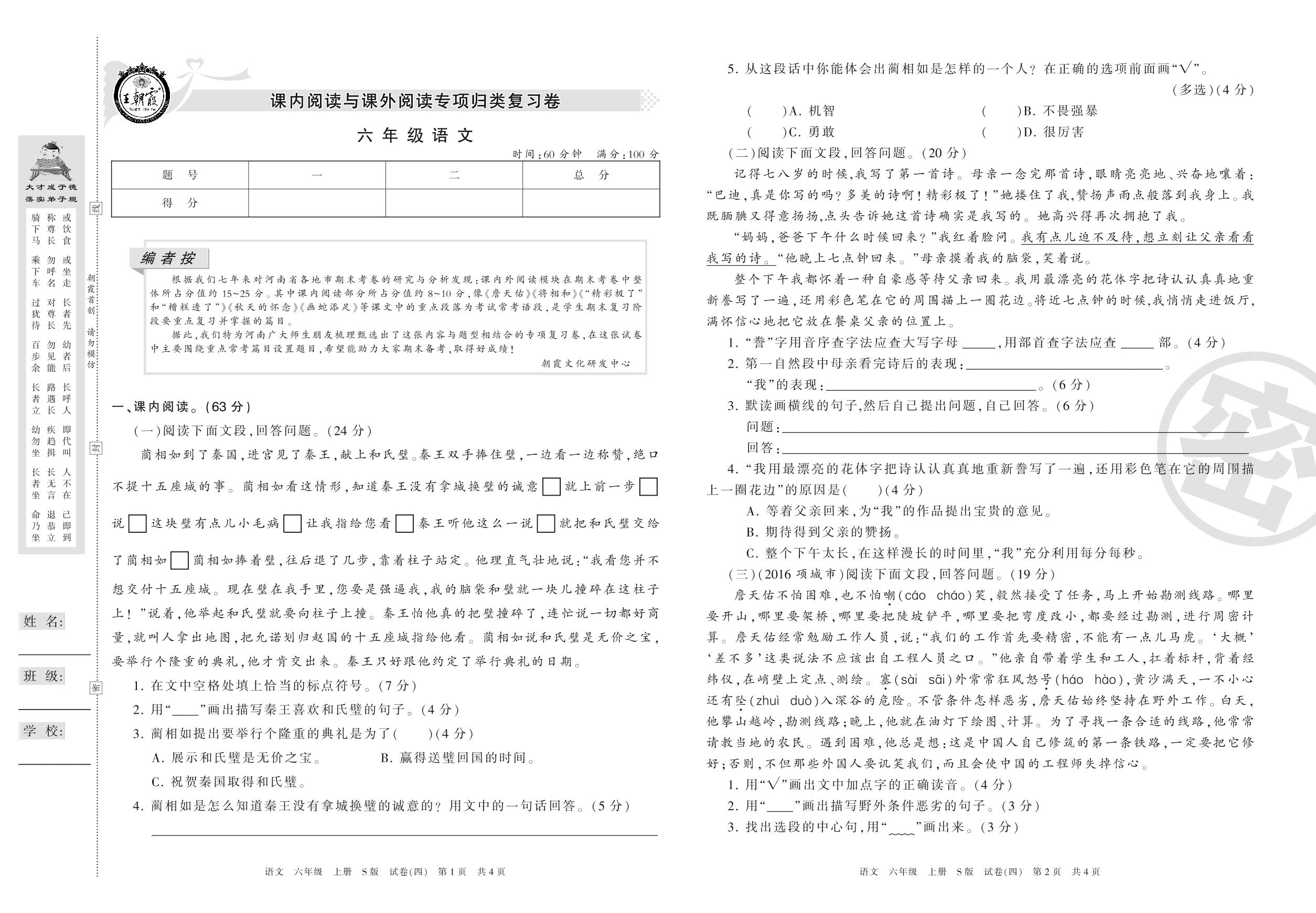 王朝霞期末专项卷六年级上册语文(S版)_R210802110033【4】