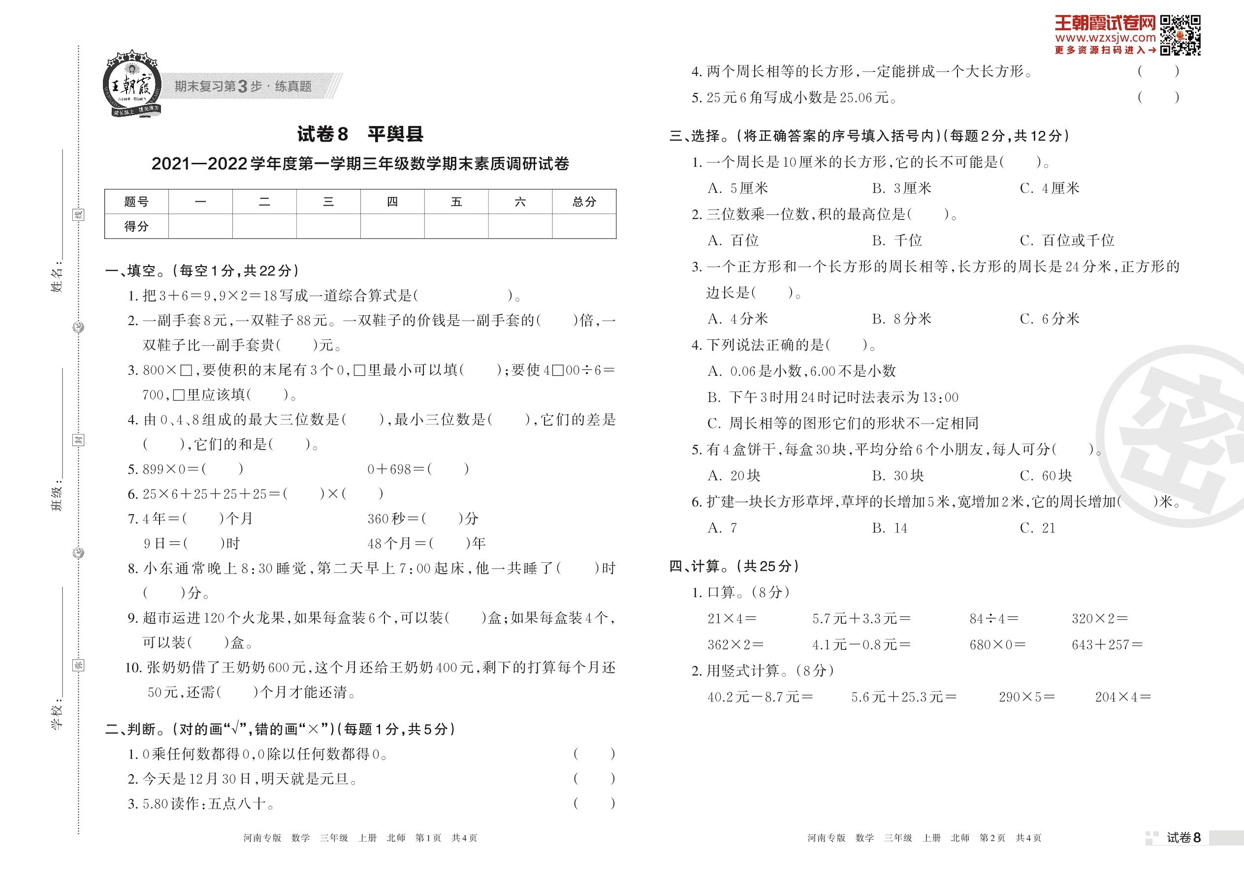 平舆县2021—2022学年度第一学期三年级数学期末素质调研试卷(北师版)【8】