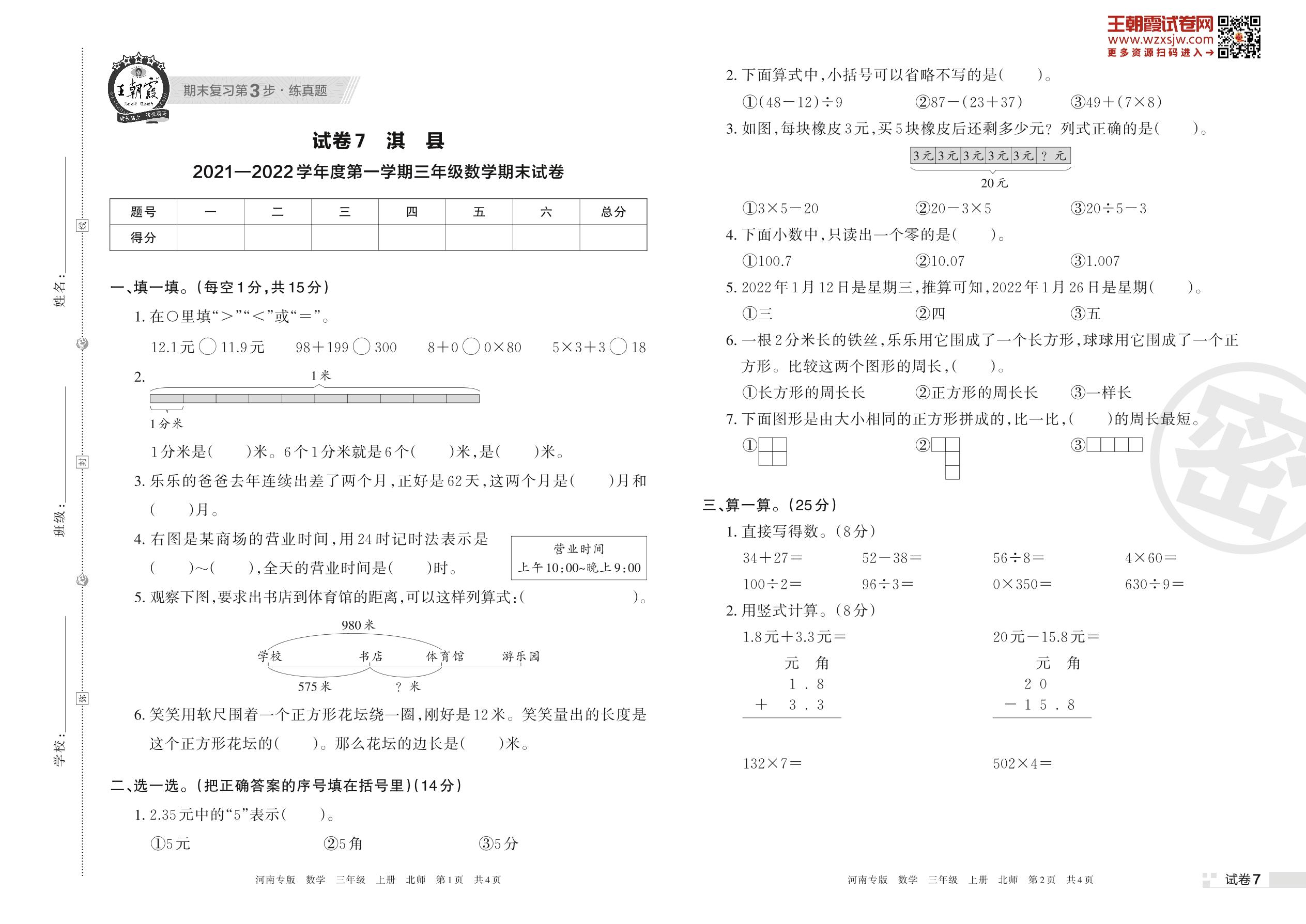 淇县2021—2022学年度第一学期三年级数学期末试卷(北师版)【7】