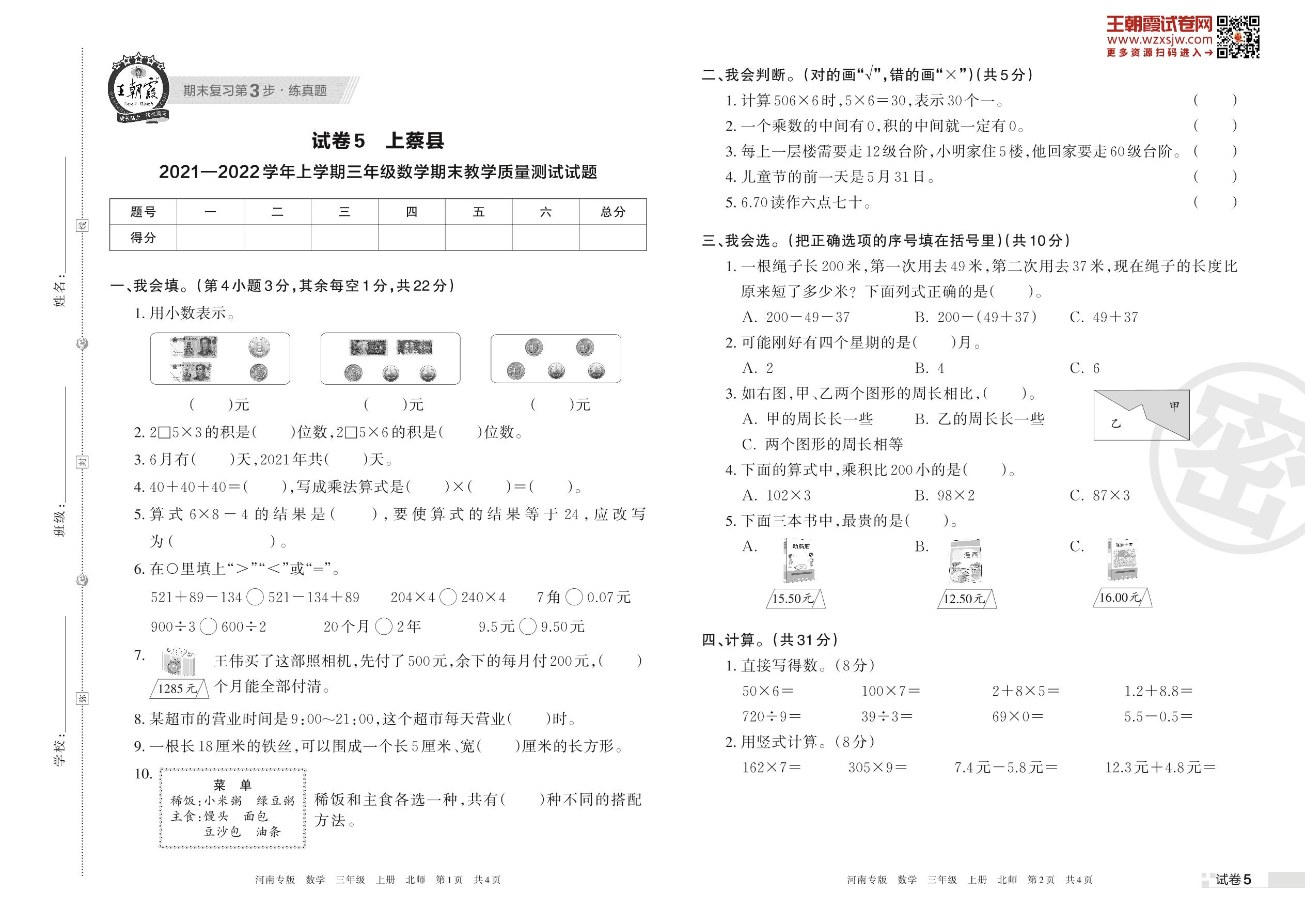 上蔡县2021—2022学年上学期三年级数学期末教学质量测试试题(北师版)【5】