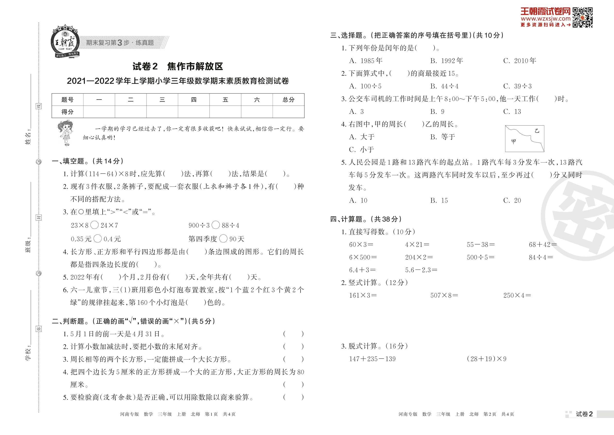 焦作市解放区2021—2022学年上学期小学三年级数学期末素质教育检测试卷(北师版)【2】