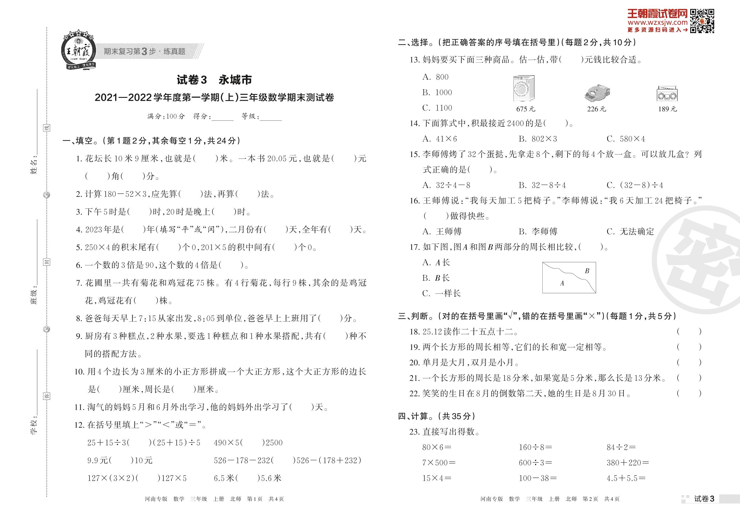 永城市2021—2022学年度第一学期(上)三年级数学期末测试卷(北师版)【3】