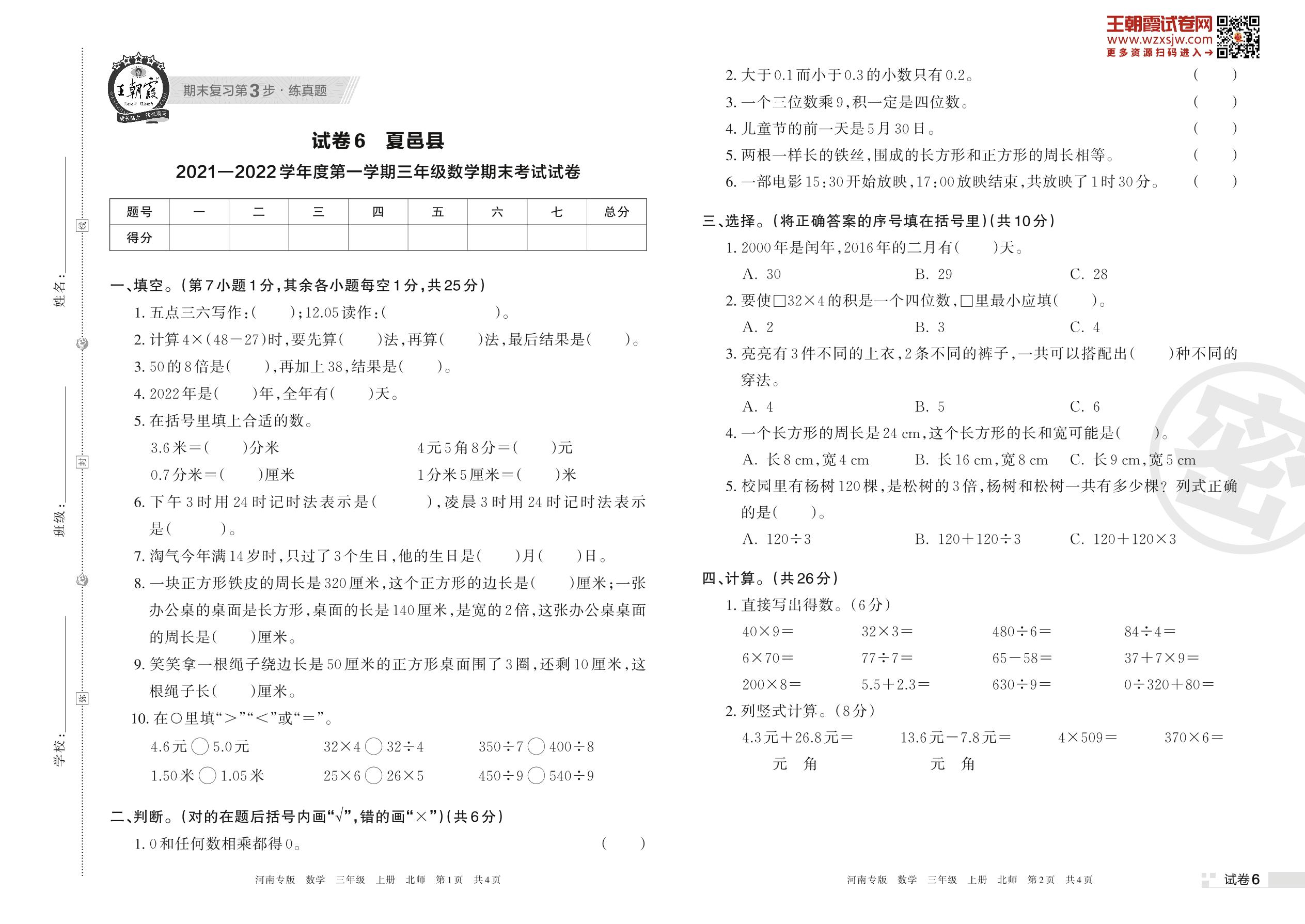 夏邑县2021—2022学年度第一学期三年级数学期末考试试卷(北师版)【6】