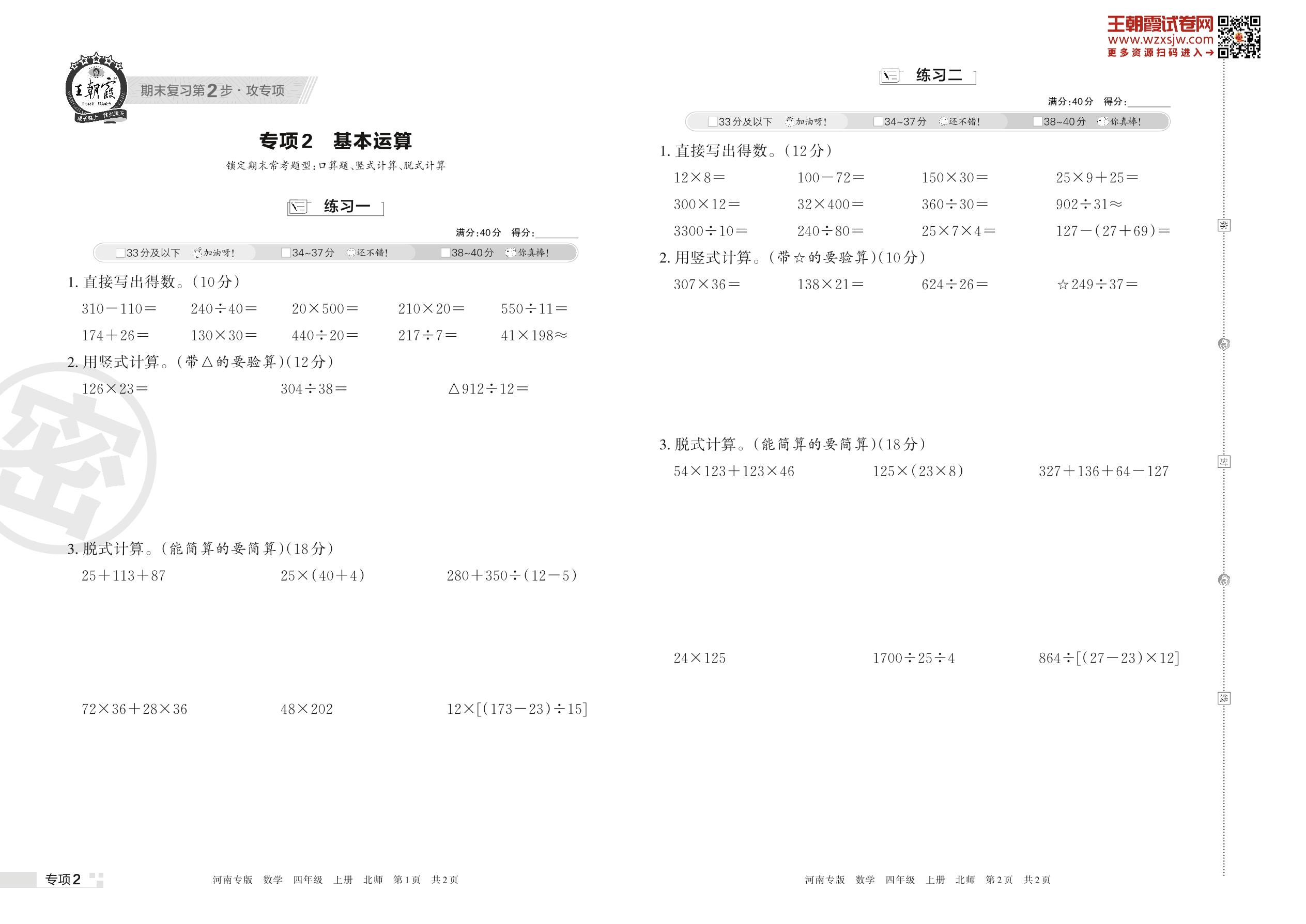 王朝霞期末专项卷——基本运算四年级上册数学(北师版)【2】