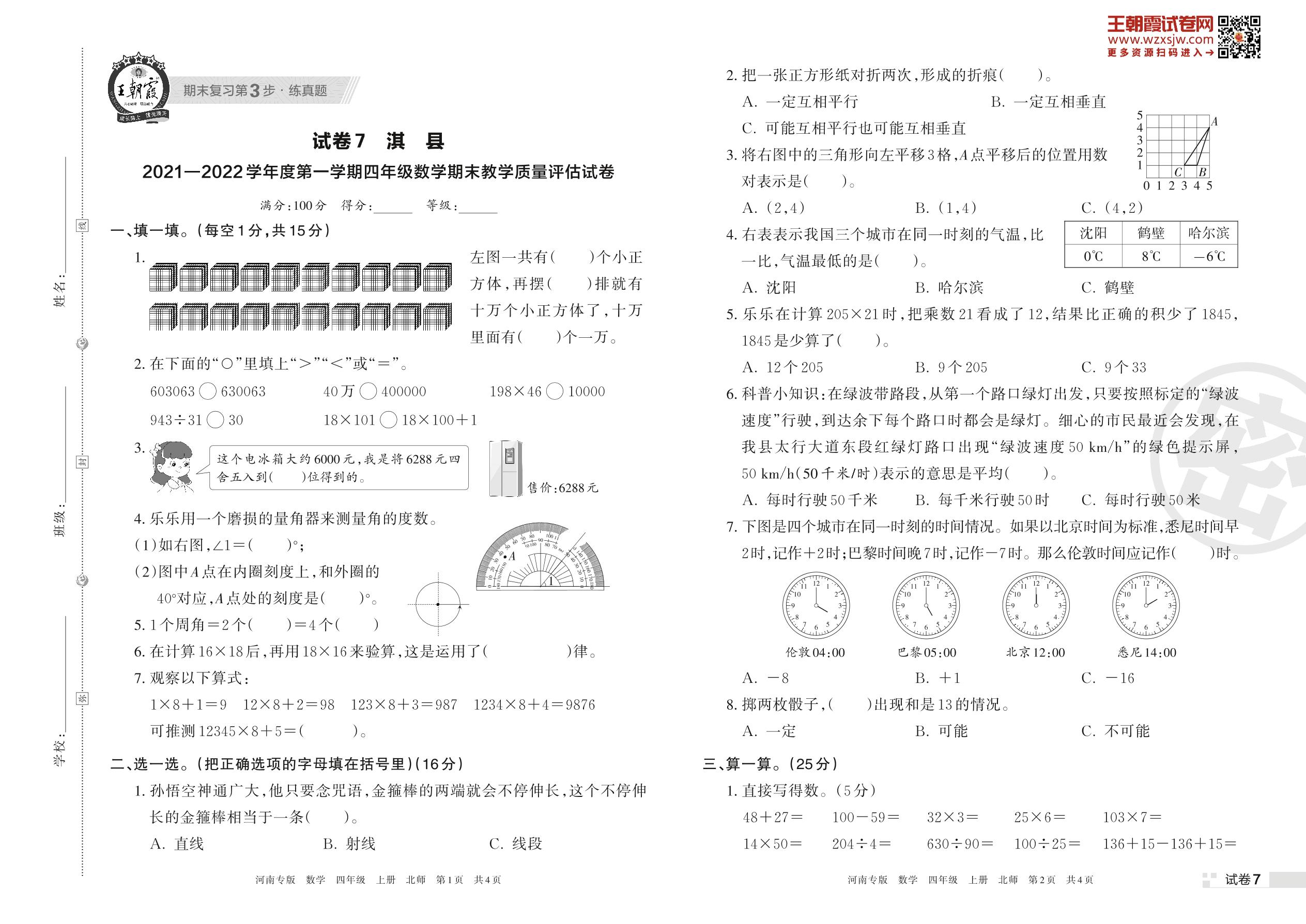 淇县2021—2022学年度第一学期四年级数学期末教学质量评估试卷(北师版)【7】