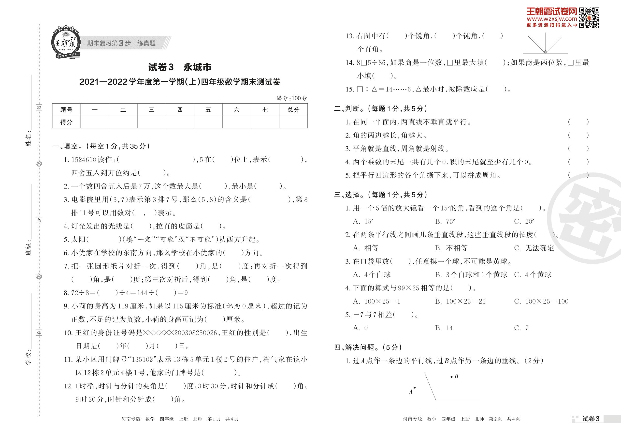 永城市2021—2022学年度第一学期(上)四年级数学期末测试卷(北师版)【3】