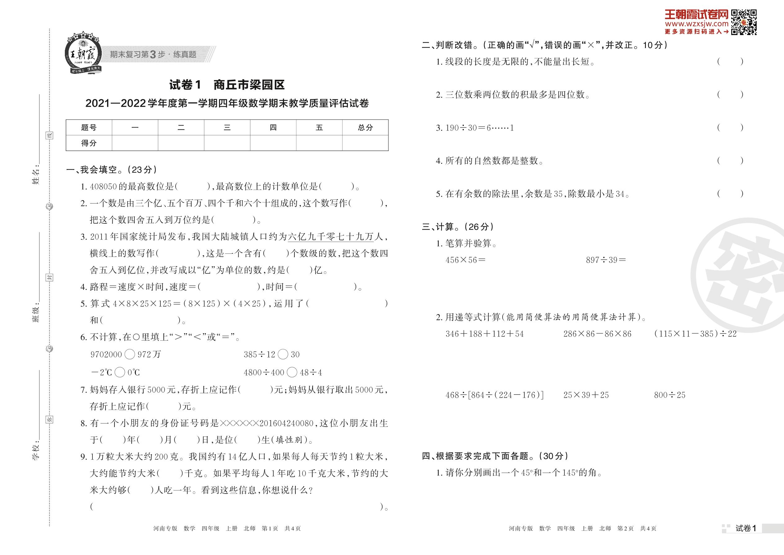 商丘市梁园区2021—2022学年度第一学期四年级数学期末教学质量评估试卷(北师版)【1】