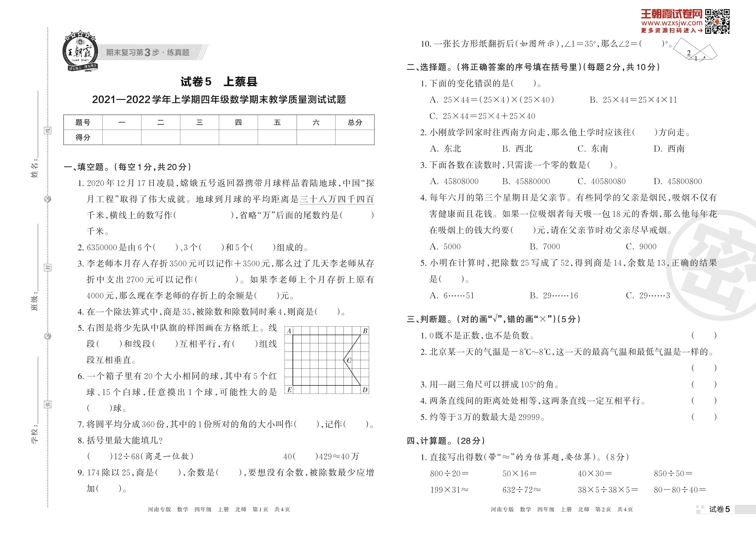 上蔡县2021—2022学年上学期四年级数学期末教学质量测试试题(北师版)【5】