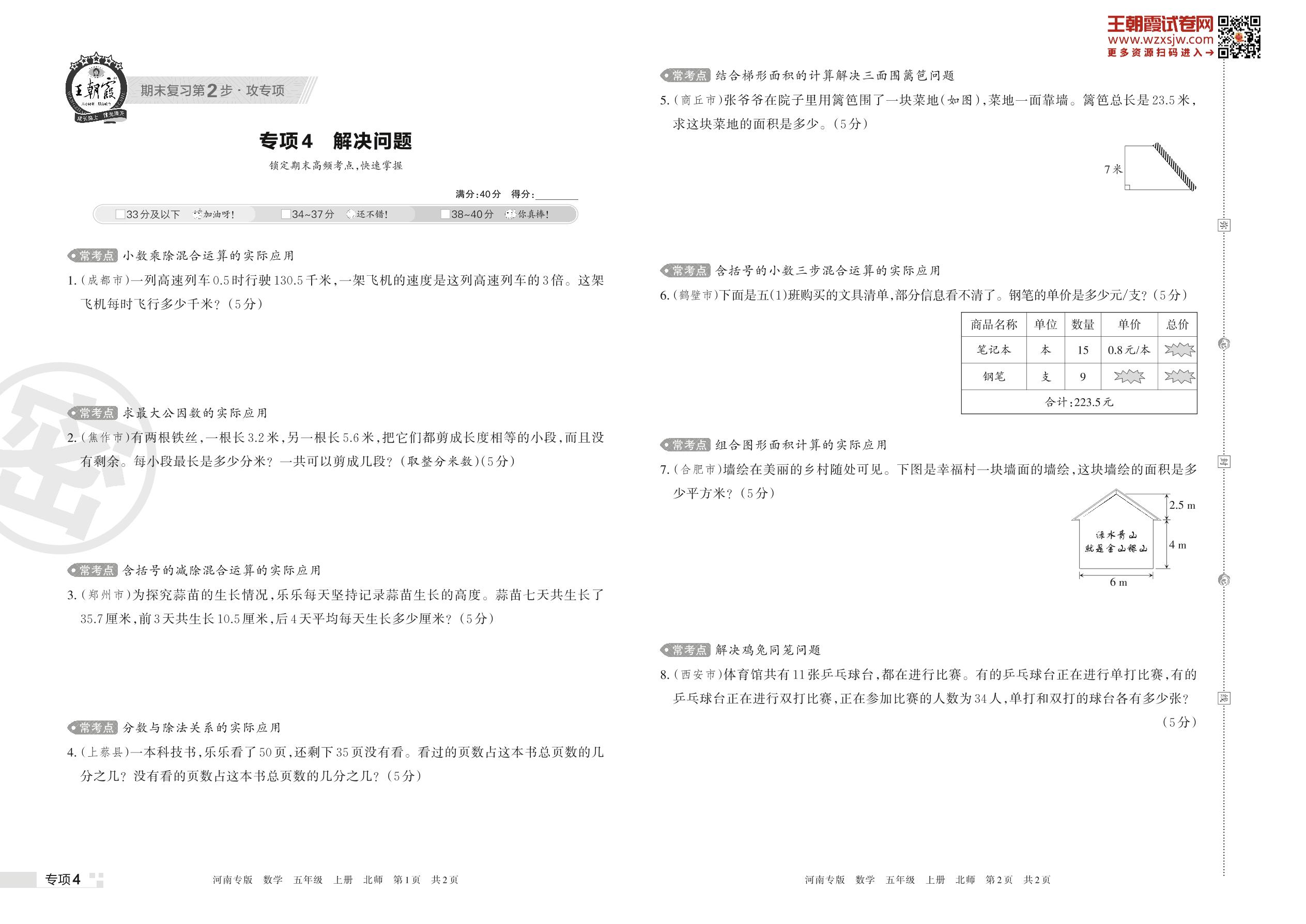 王朝霞期末专项卷——解决问题五年级上册数学(北师版)【4】