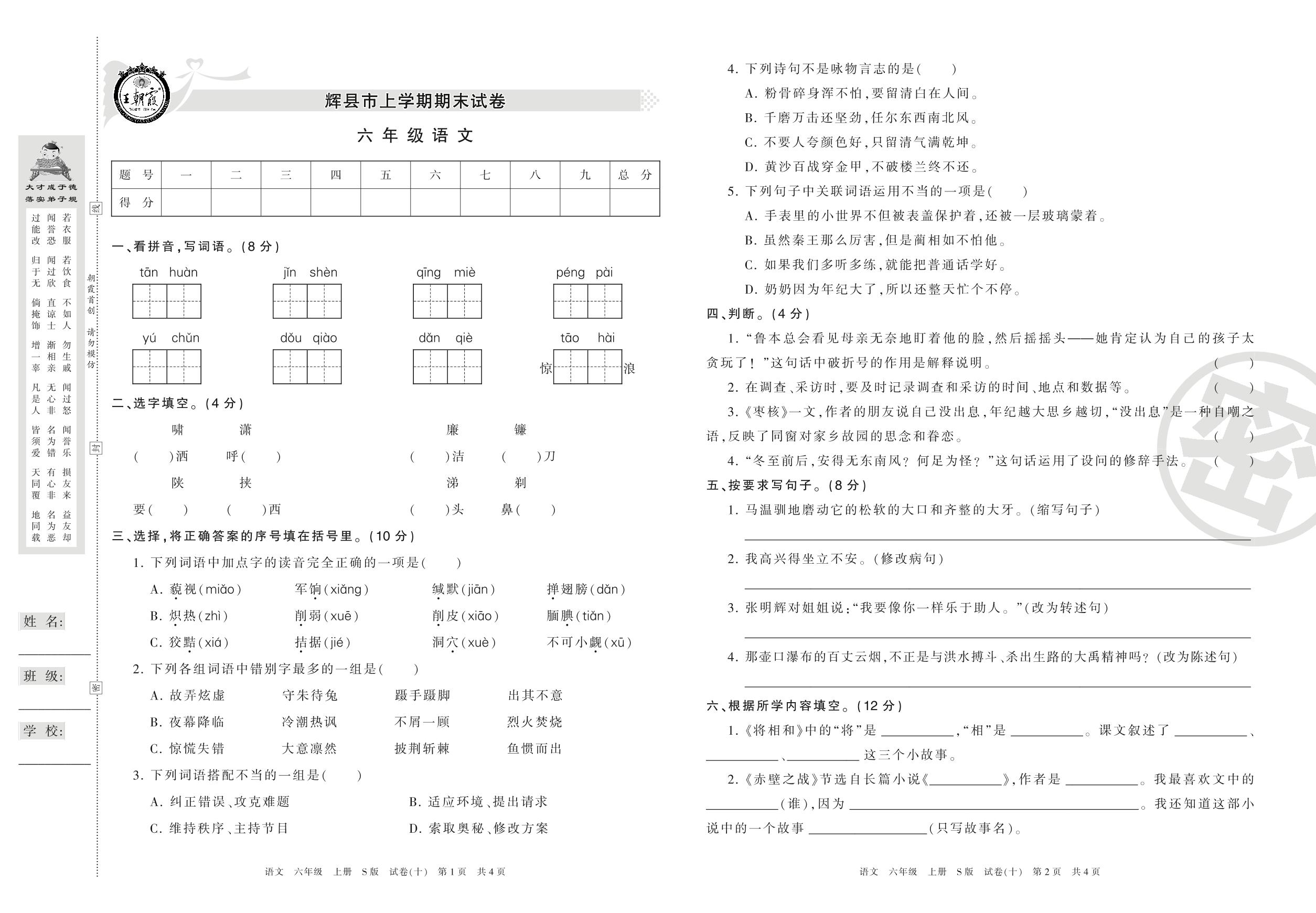 2016-2017学年第一学期辉县市六年级语文试卷(S版)【10】