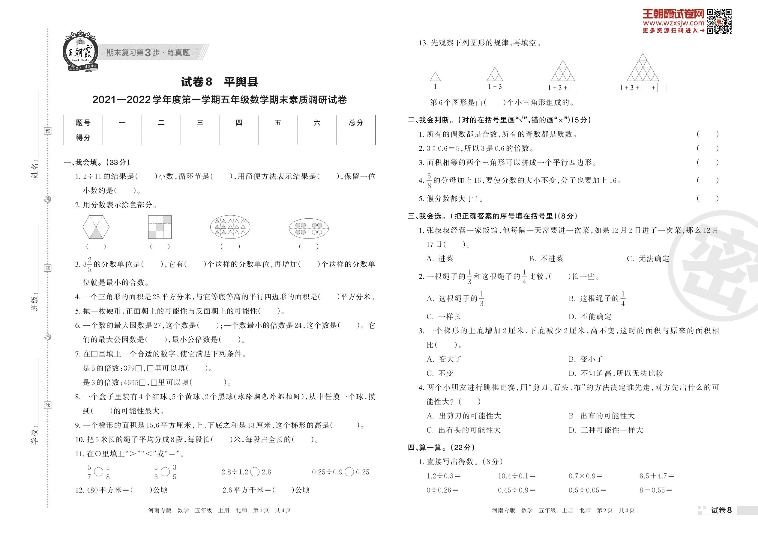 平舆县2021—2022学年度第一学期五年级数学期末素质调研试卷(北师版)【8】