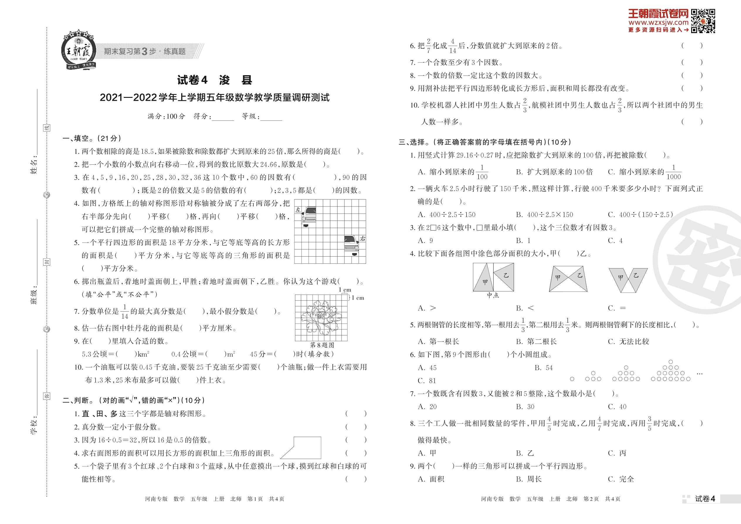 浚县2021—2022学年上学期五年级数学教学质量调研测试(北师版)【4】