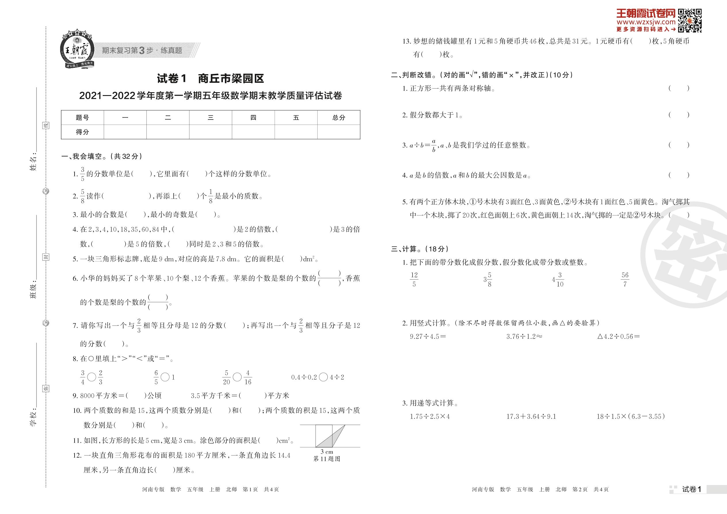 商丘市梁园区2021—2022学年度第一学期五年级数学期末教学质量评估试卷(北师版)【1】