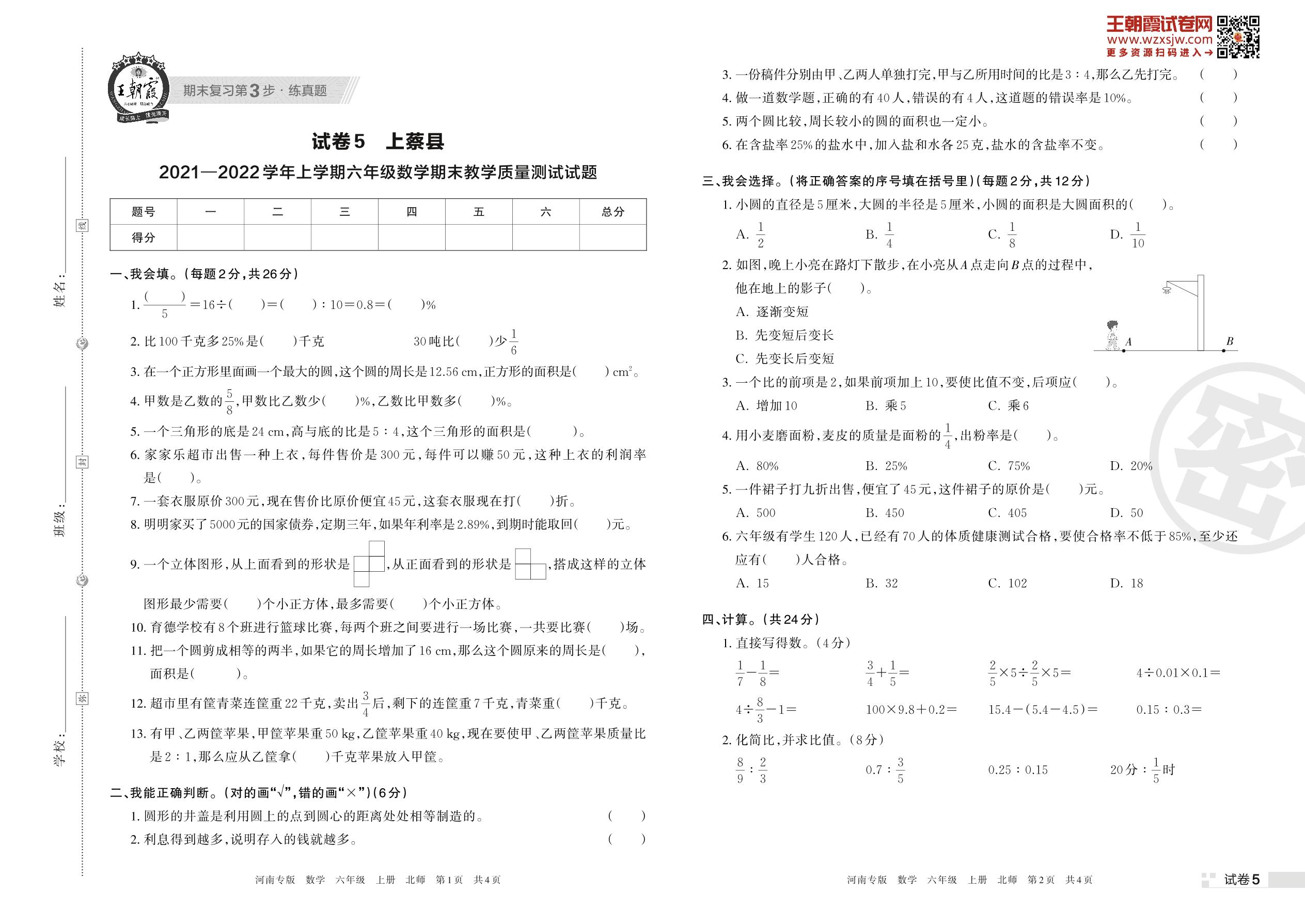 上蔡县2021—2022学年上学期六年级数学期末教学质量测试试题(北师版)【5】