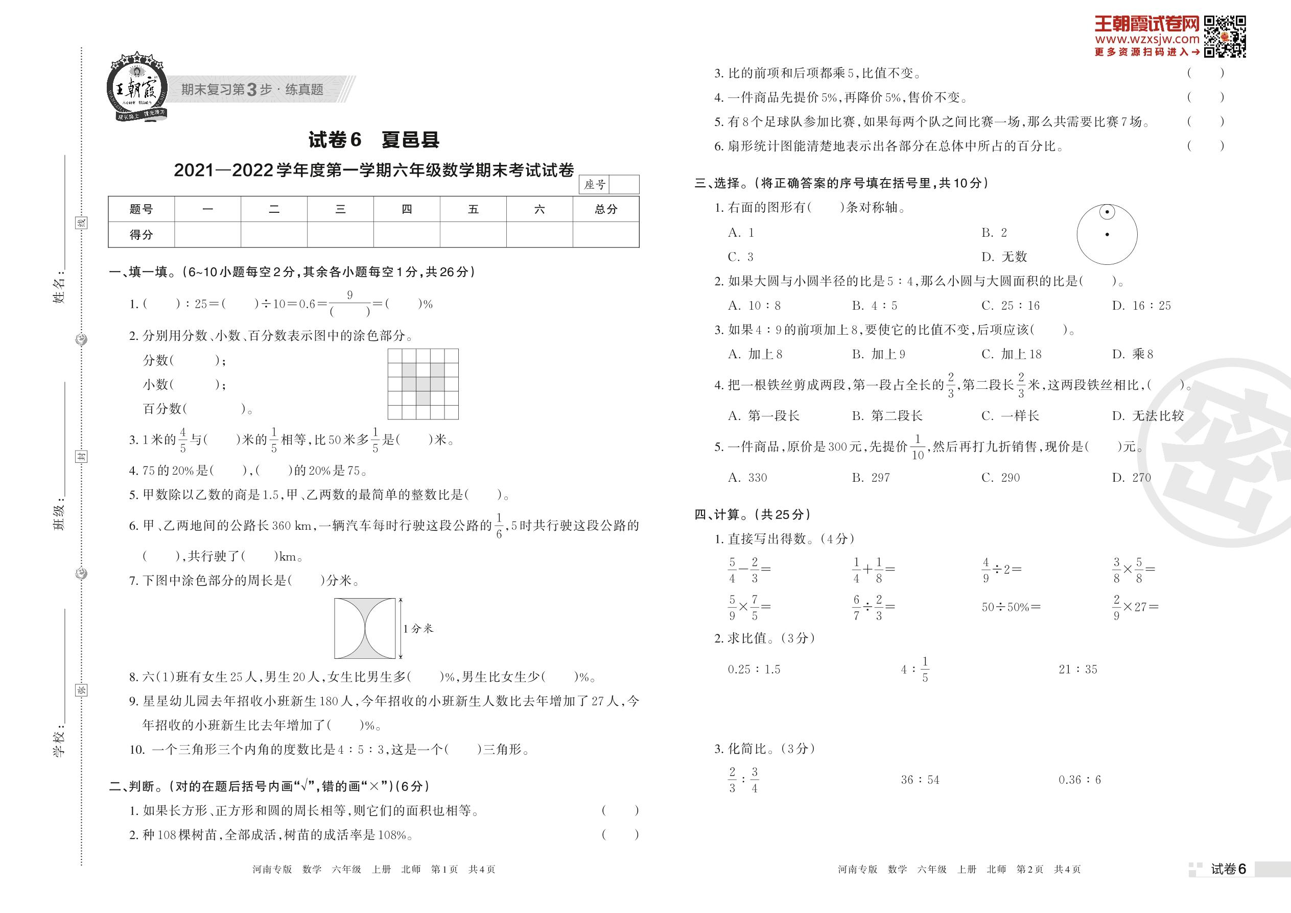 夏邑县2021—2022学年度第一学期六年级数学期末考试试卷(北师版)【6】