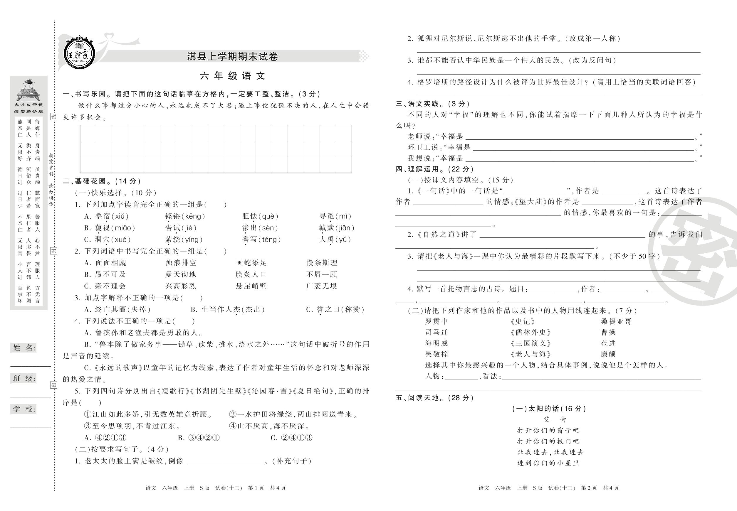 2016-2017学年第一学期鹤壁市淇县六年级语文试卷(S版)【13】
