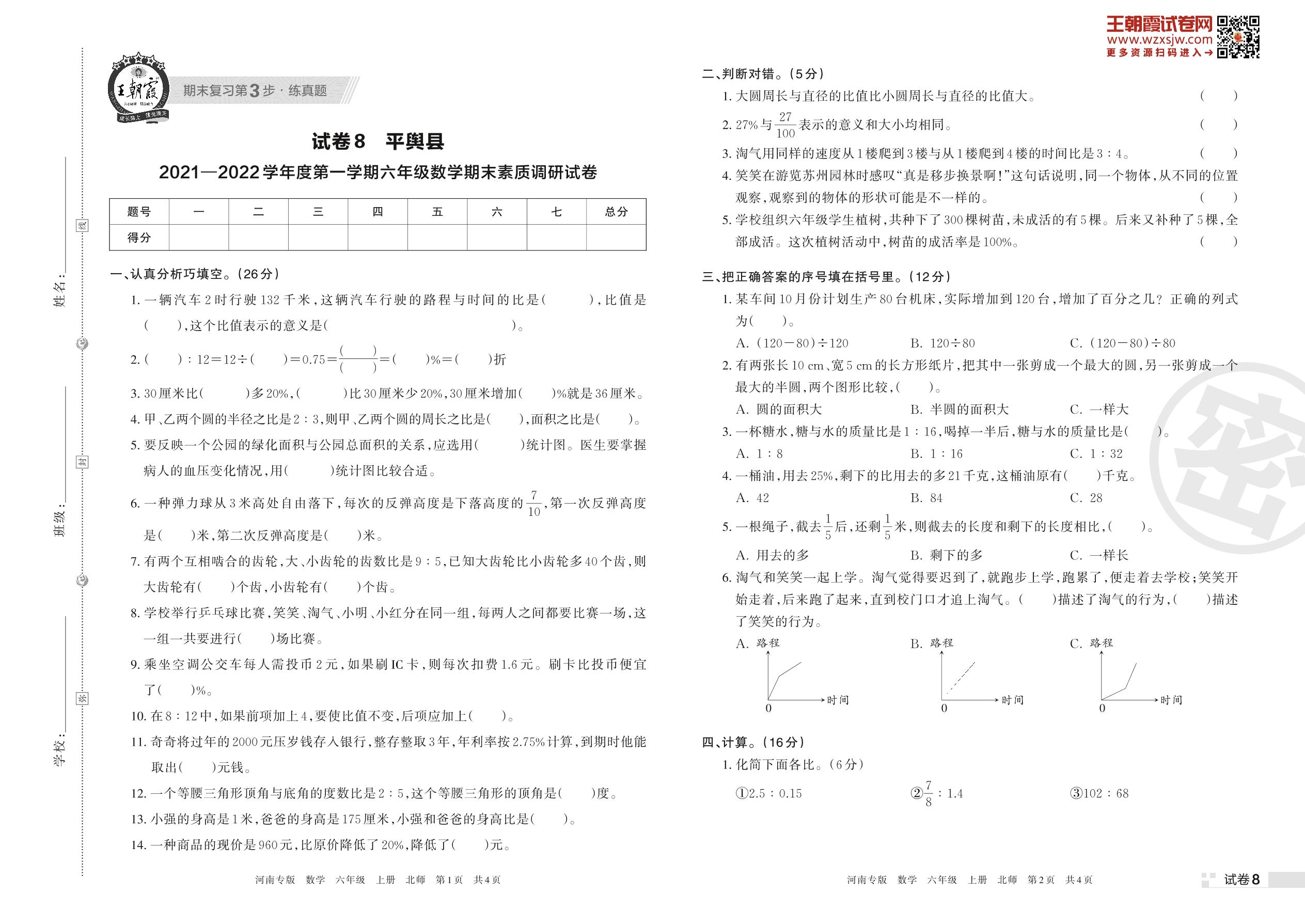 平舆县2021—2022学年度第一学期六年级数学期末素质调研试卷(北师版)【8】