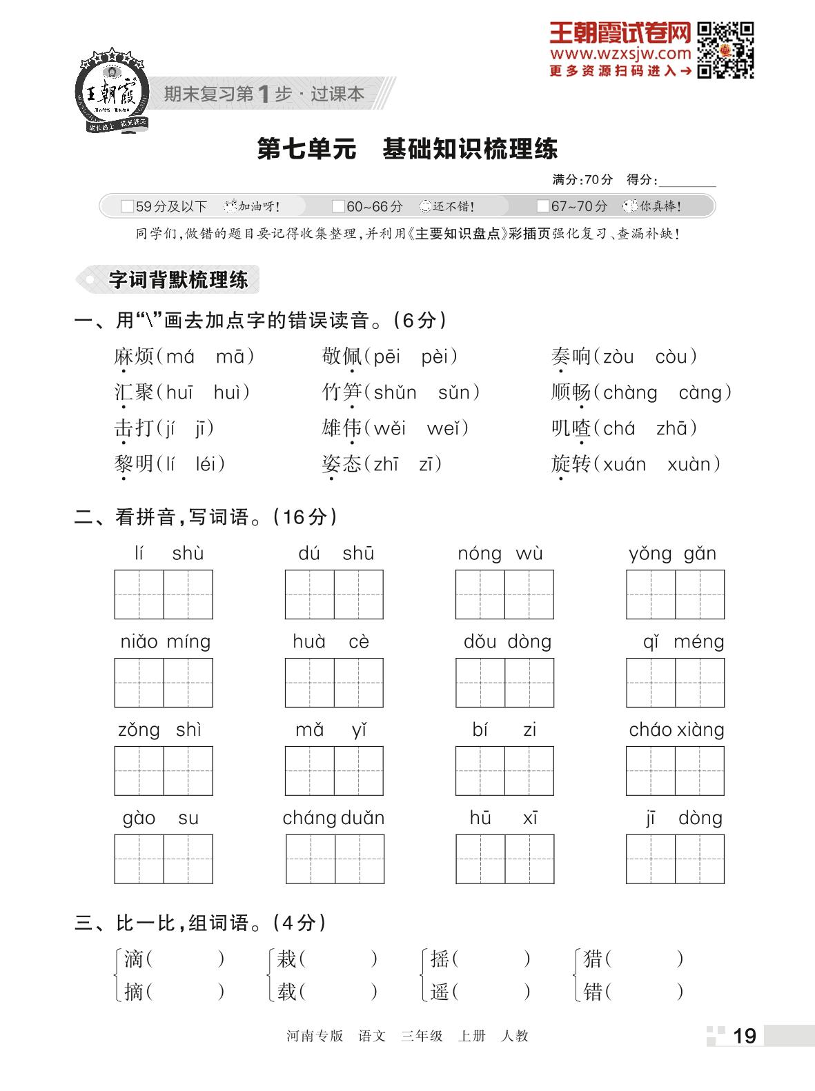 王朝霞期末过课本——第七单元 基础知识梳理练三年级上册语文(人教版)