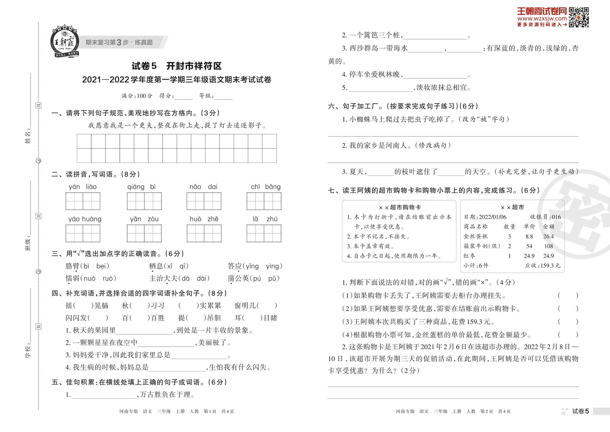 开封市祥符区2021—2022学年度第一学期三年级语文期末考试试卷(人教版)【5】