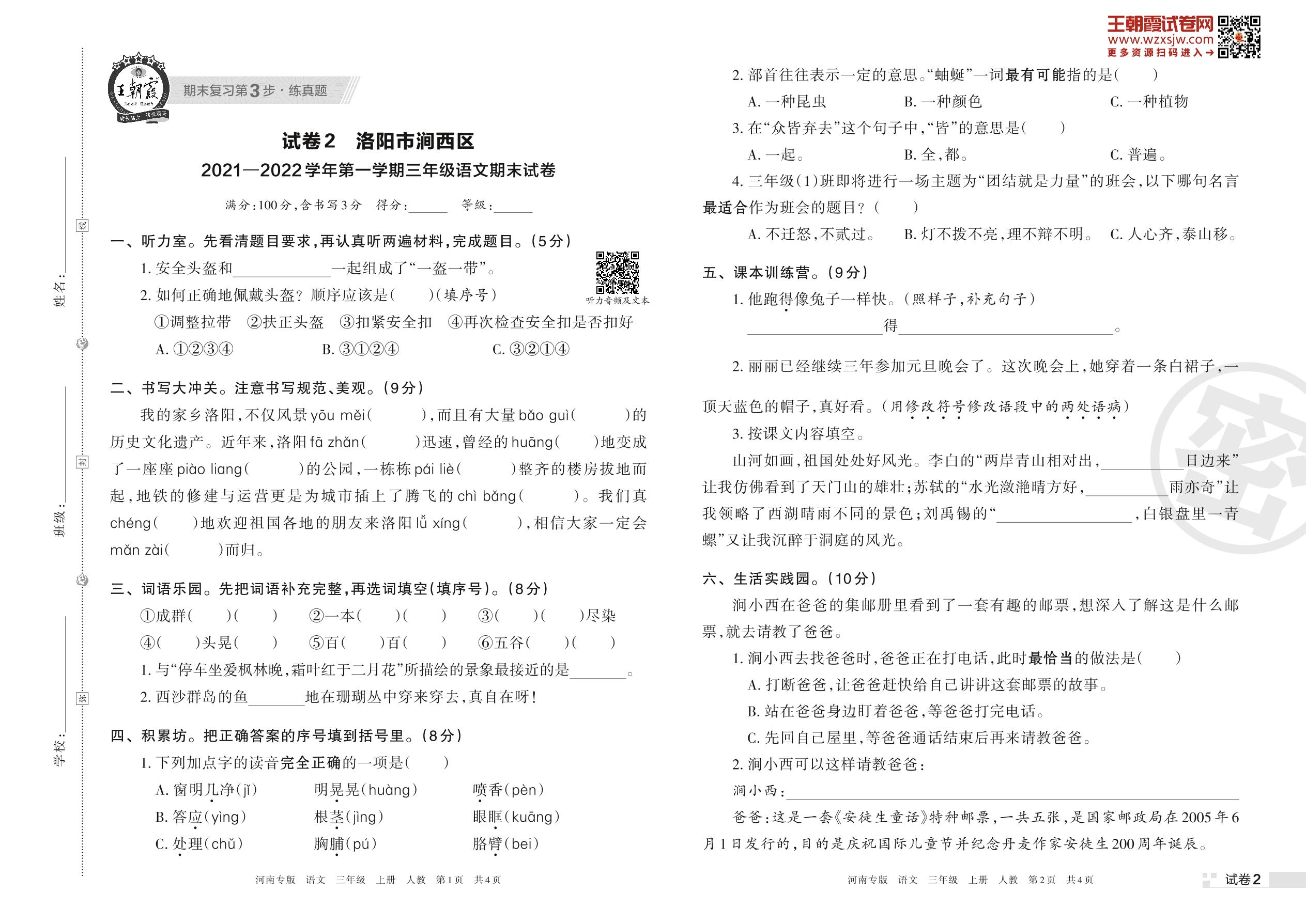 洛阳市涧西区2021—2022学年第一学期三年级语文期末试卷(人教版)【2】
