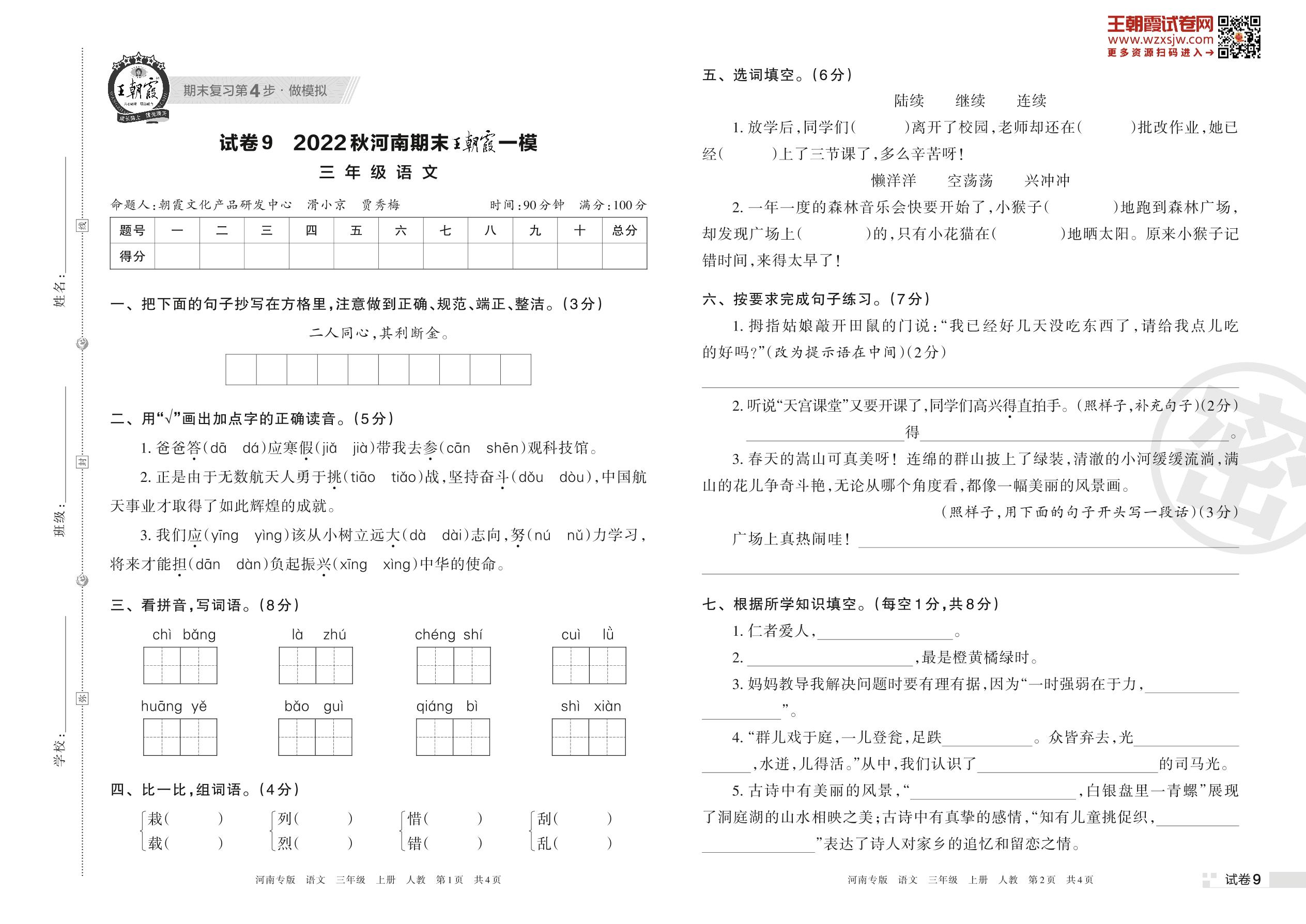 王朝霞期末模拟卷三年级上册语文(人教版)_R221111163113344【9】