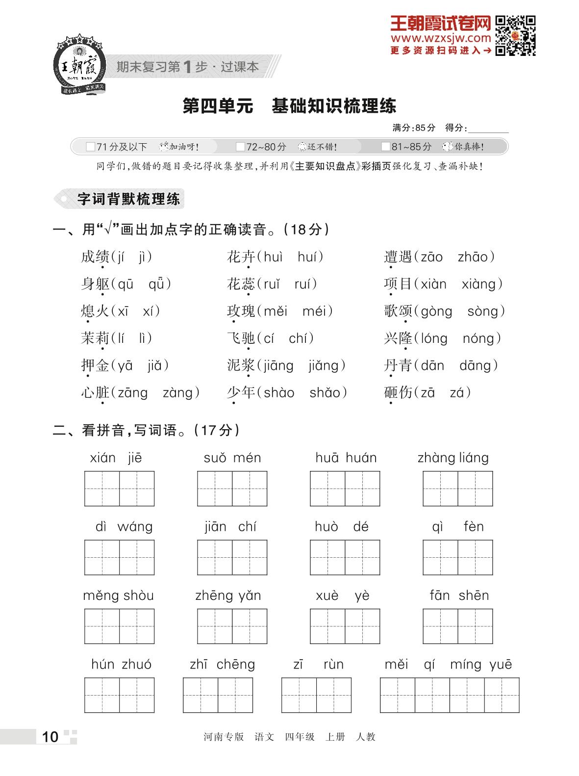 王朝霞期末过课本——第四单元 基础知识梳理练四年级上册语文(人教版)