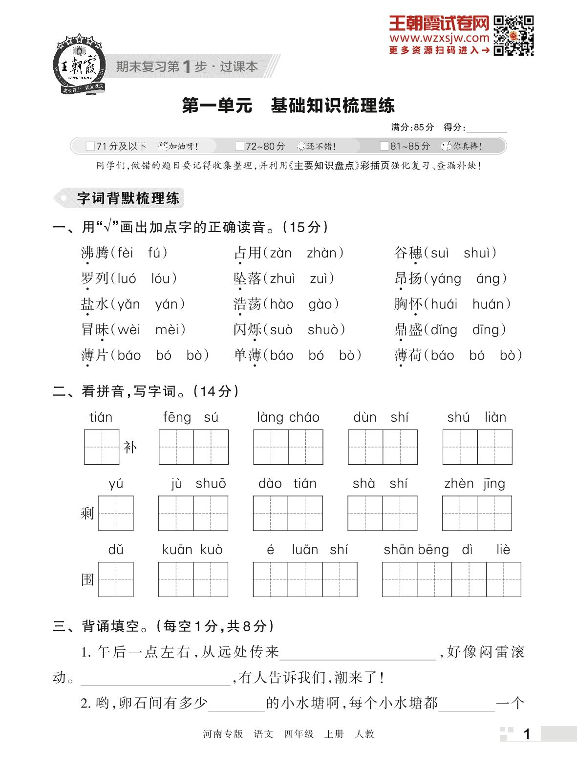王朝霞期末过课本——第一单元 基础知识梳理练四年级上册语文(人教版)