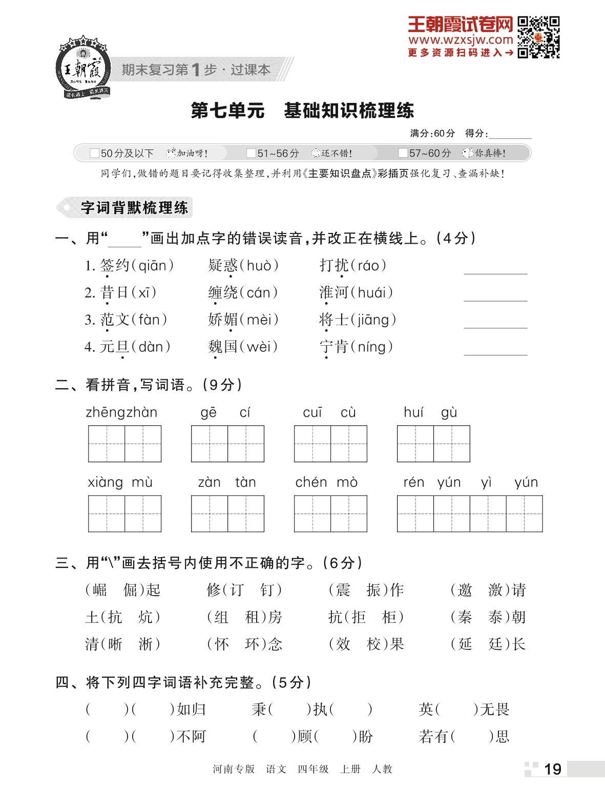 王朝霞期末过课本——第七单元 基础知识梳理练四年级上册语文(人教版)