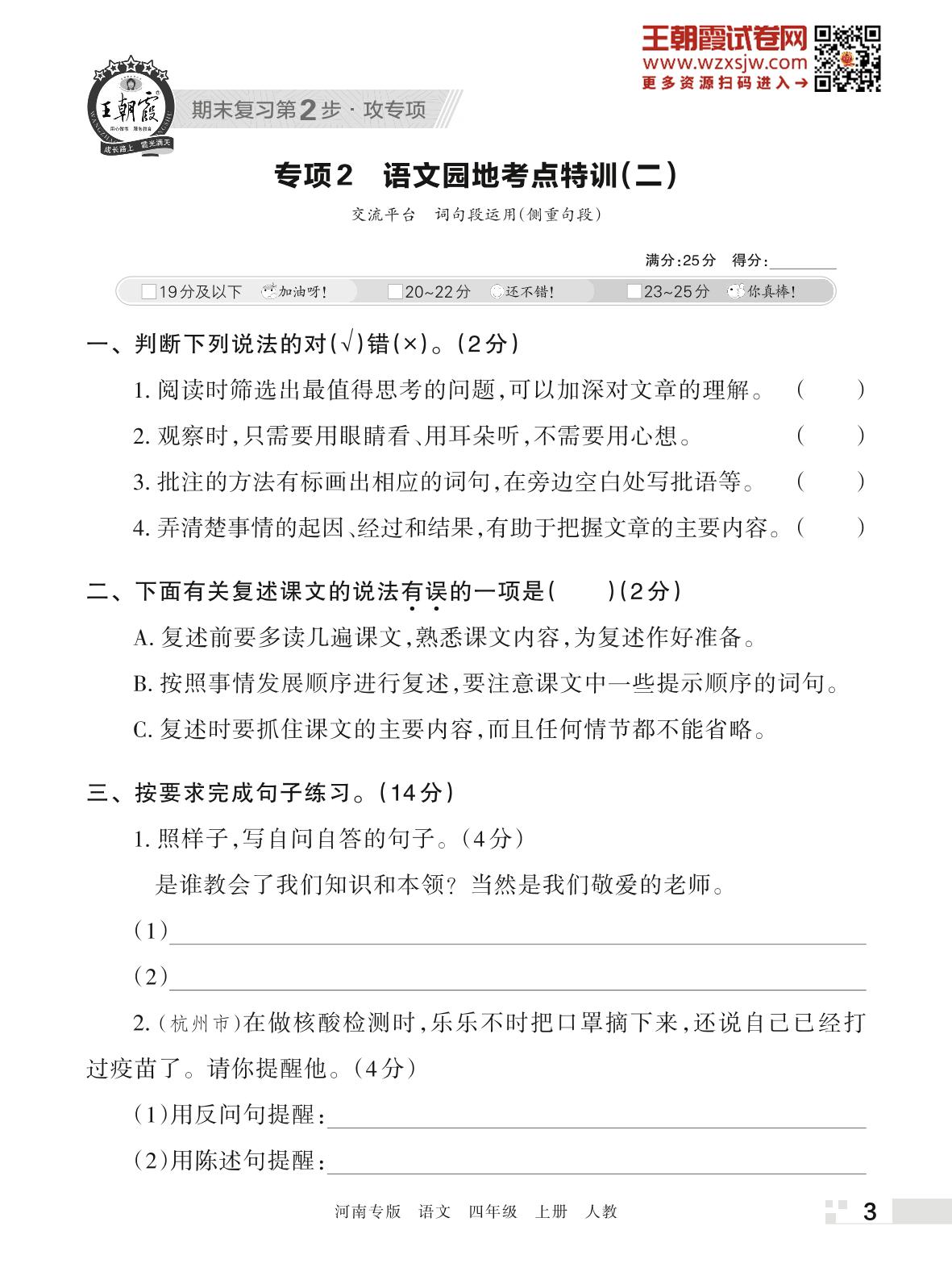 王朝霞期末专项卷——语文园地考点特训(二)四年级上册语文(人教版)【2】