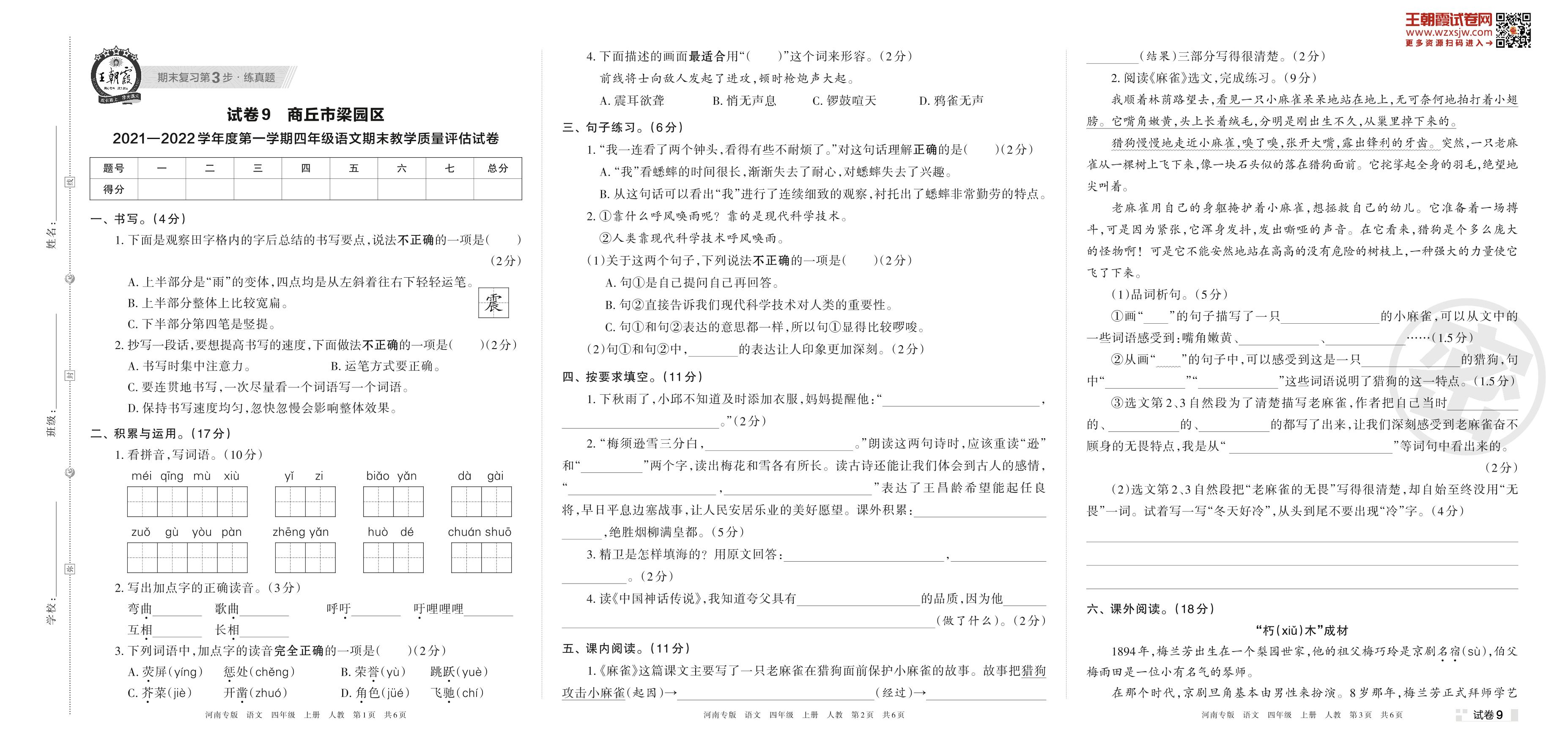 商丘市梁园区2021—2022学年度第一学期四年级语文期末教学质量评估试卷(人教版)【9】
