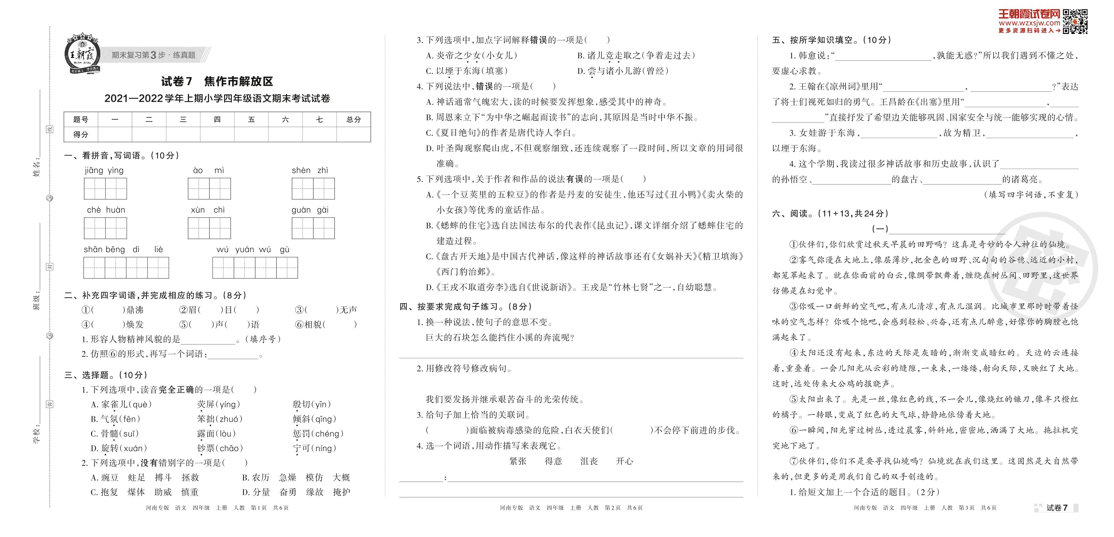 焦作市解放区2021—2022学年上期小学四年级语文期末考试试卷(人教版)【7】