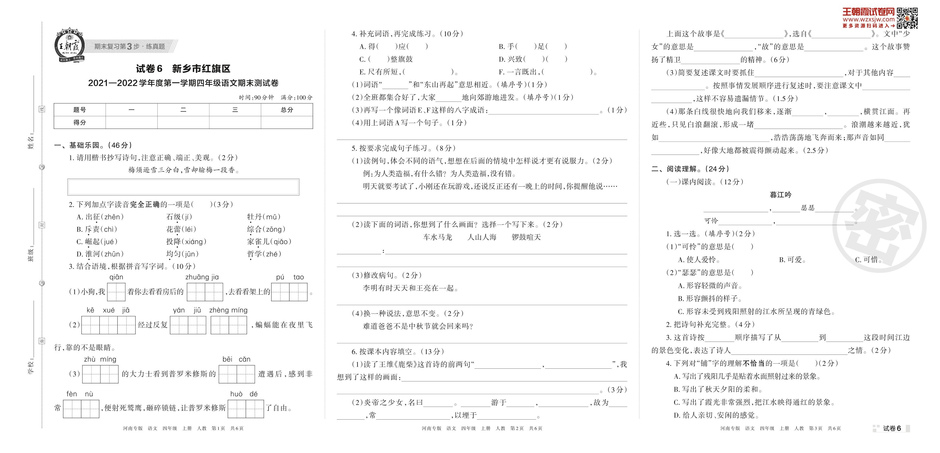 新乡市红旗区2021—2022学年度第一学期四年级语文期末测试卷(人教版)【6】