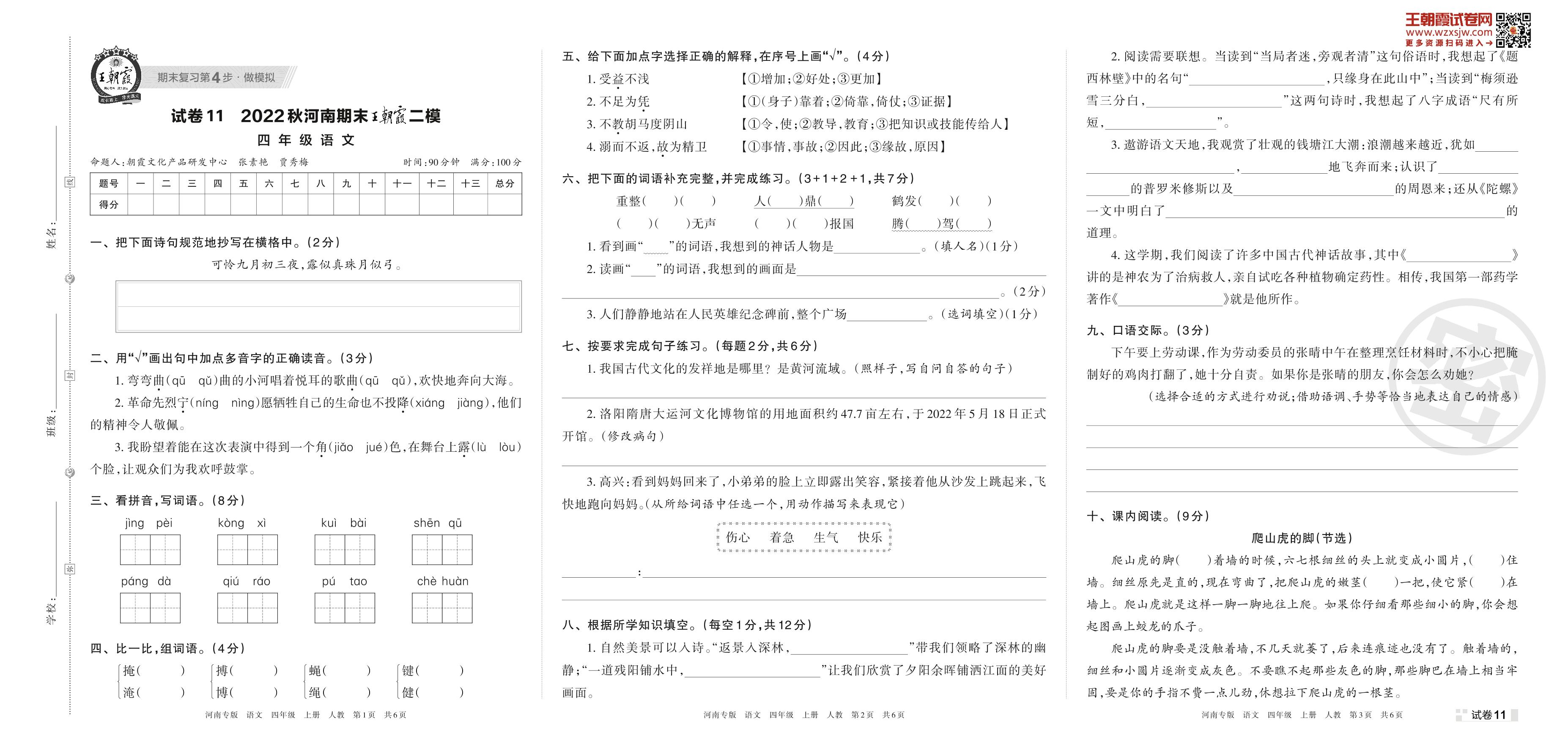 王朝霞期末模拟卷四年级上册语文(人教版)_R221111164305191【11】
