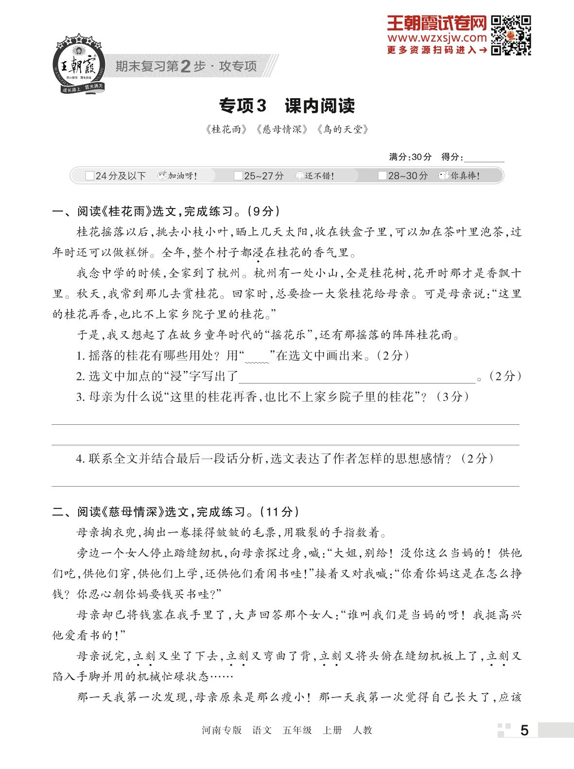 王朝霞期末专项卷——课内阅读五年级上册语文(人教版)【3】