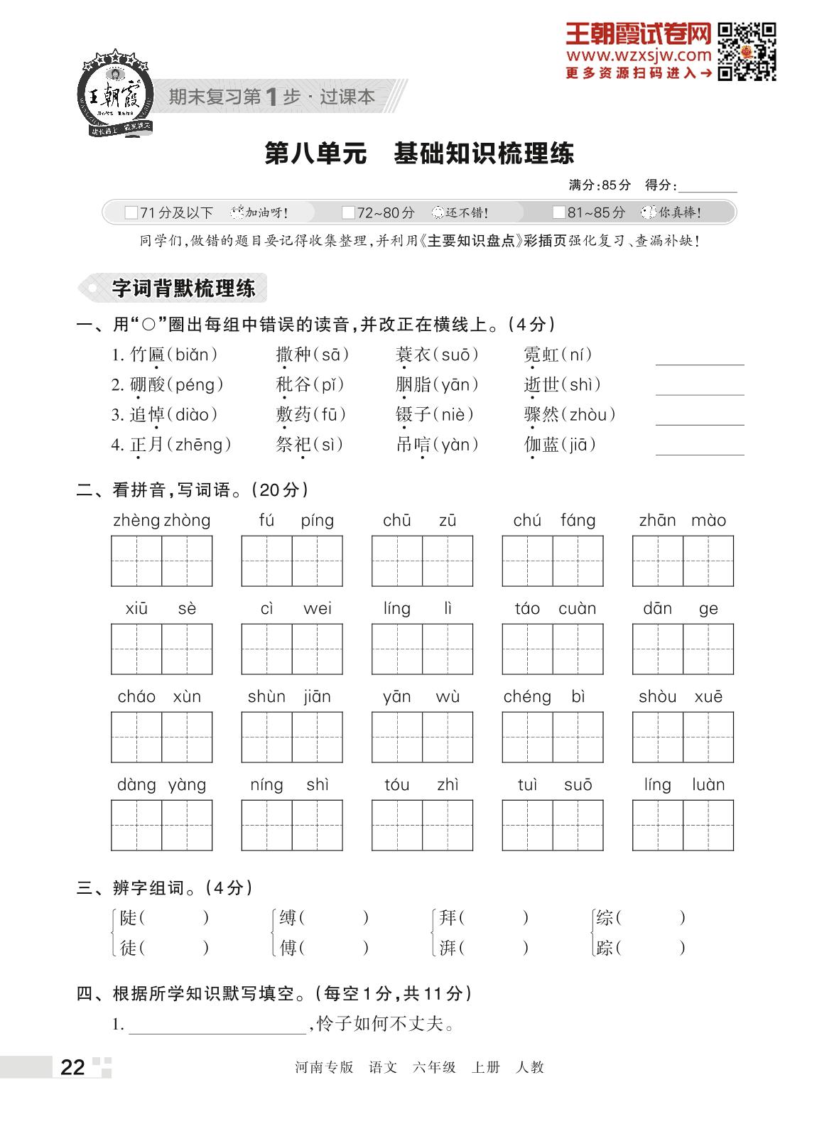王朝霞期末过课本——第八单元 基础知识梳理练六年级上册语文(人教版)