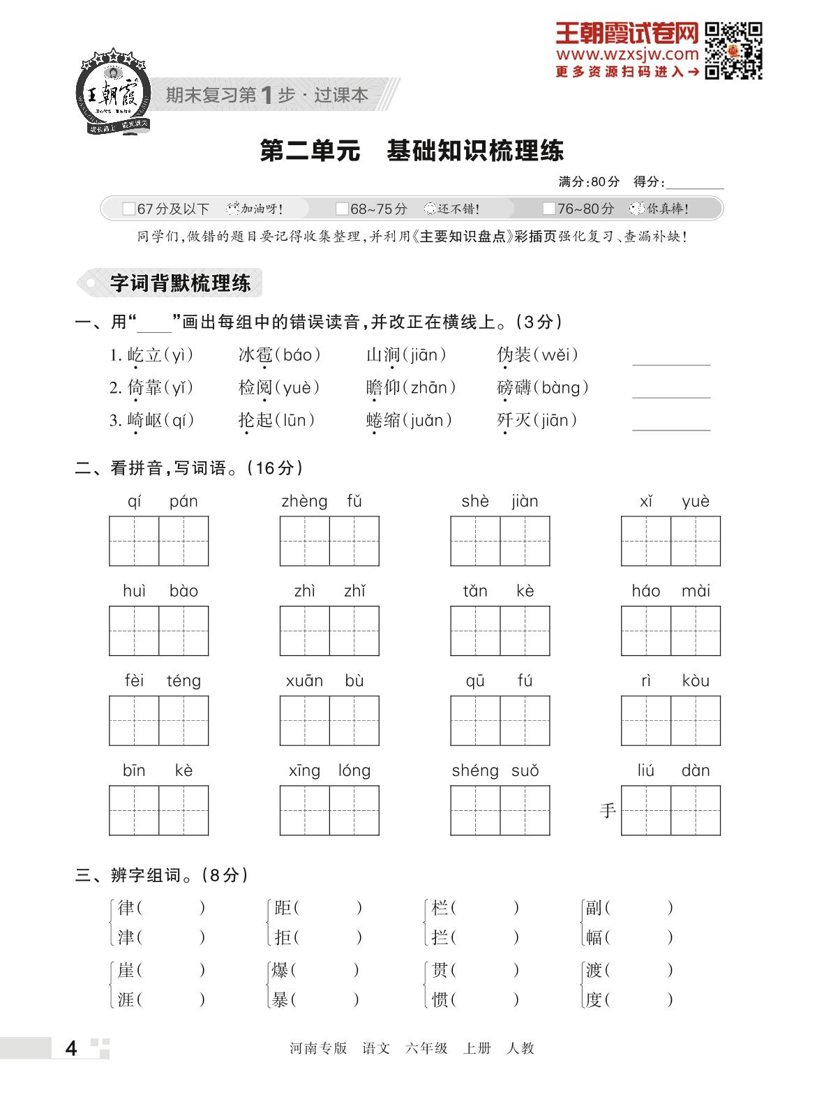 王朝霞期末过课本——第二单元 基础知识梳理练六年级上册语文(人教版)
