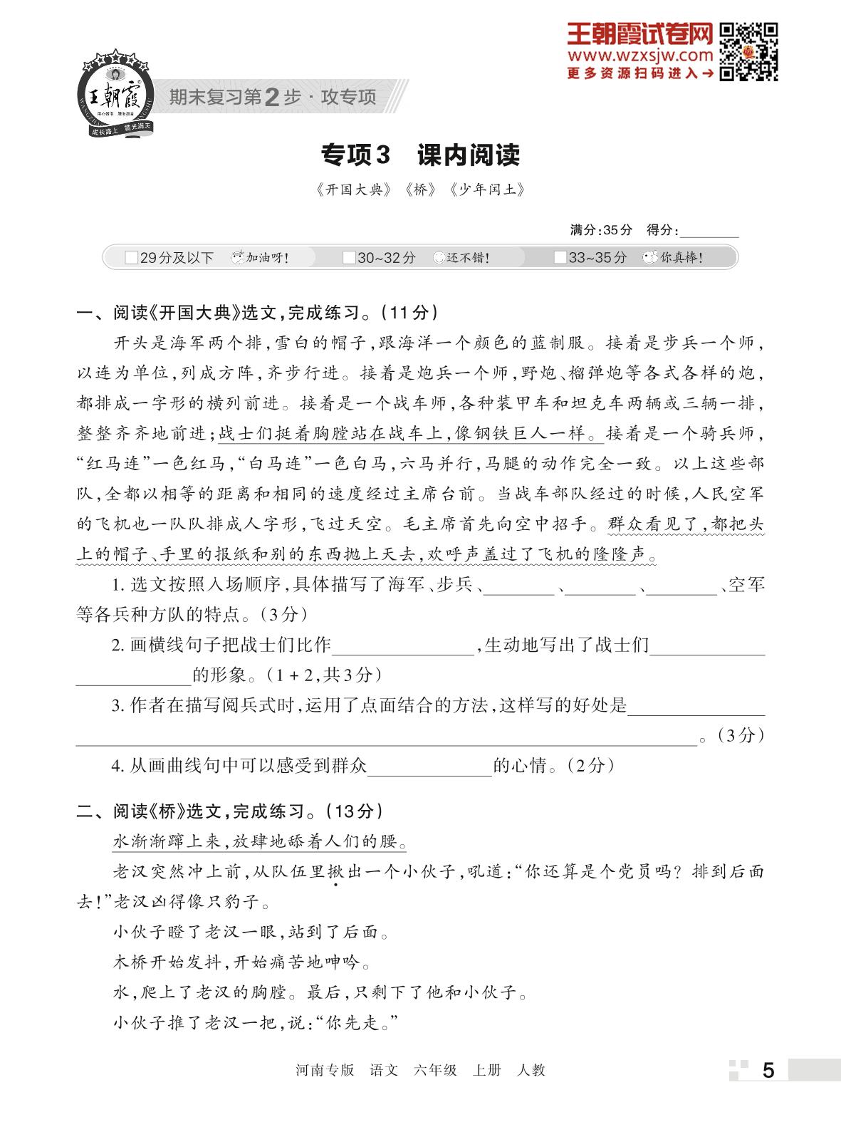王朝霞期末专项卷——课内阅读六年级上册语文(人教版)【3】