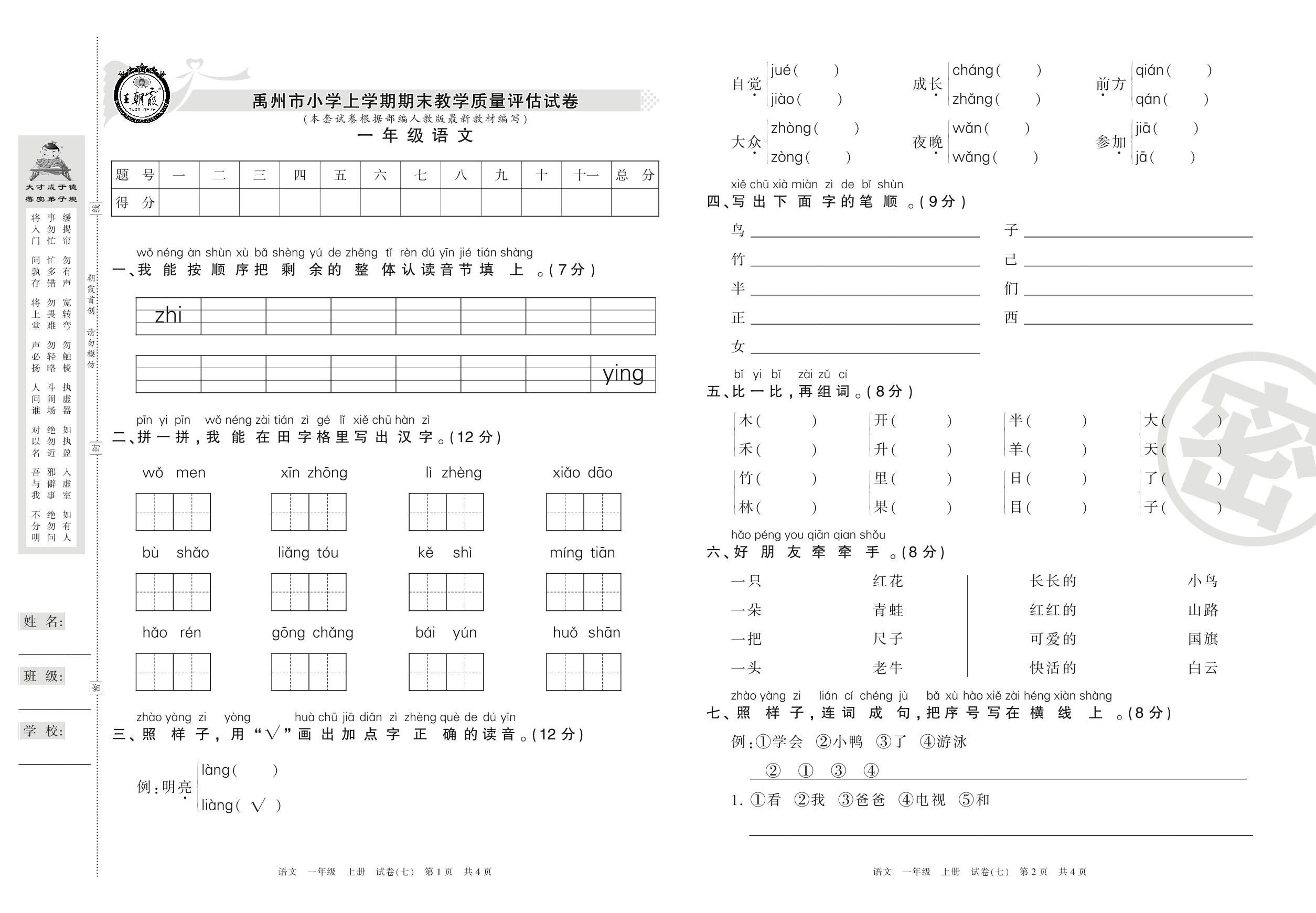 2016-2017学年第一学期禹州市一年级语文试卷(人教版)【7】