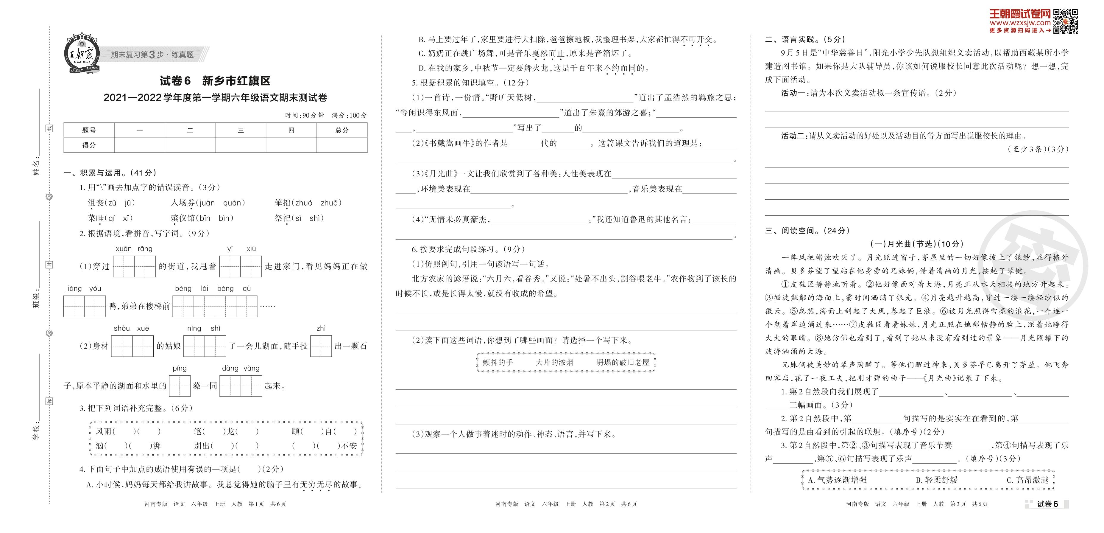 新乡市红旗区2021—2022学年度第一学期六年级语文期末测试卷(人教版)【6】