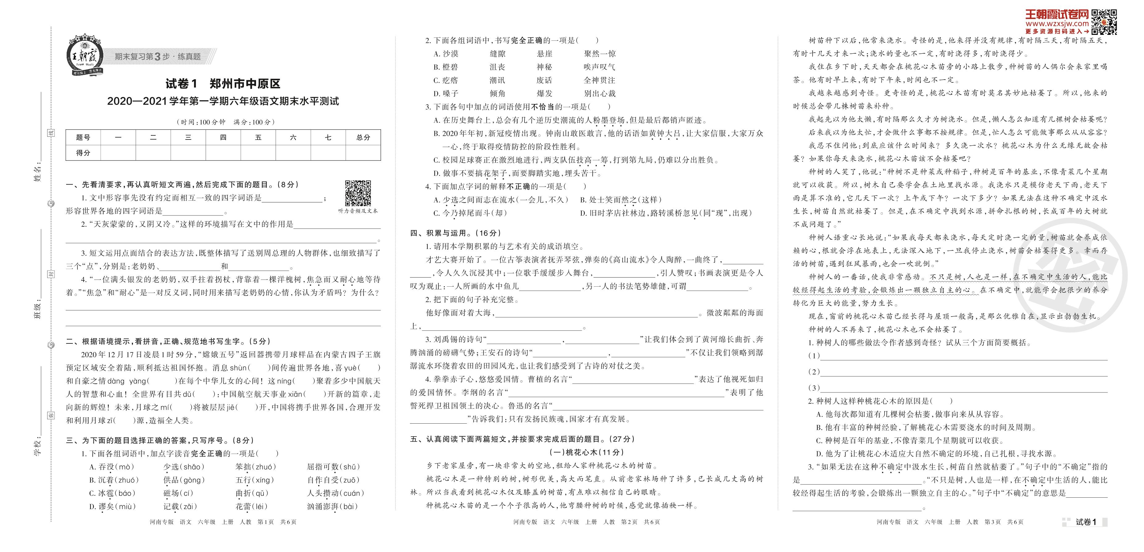 郑州市中原区2020—2021学年第一学期六年级语文期末水平测试(人教版)【1】