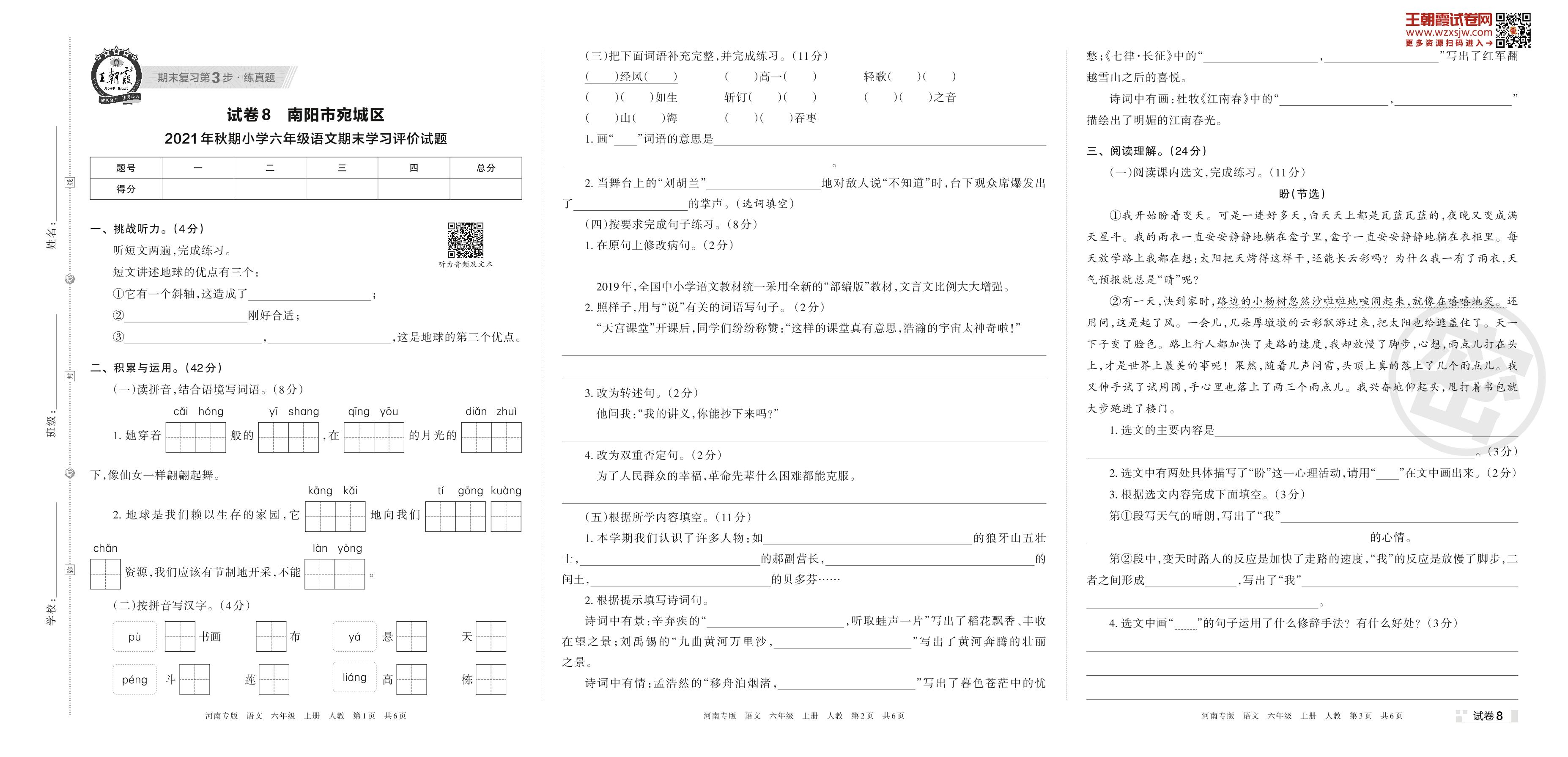 南阳市宛城区2021年秋期小学六年级语文期末学习评价试题(人教版)【8】