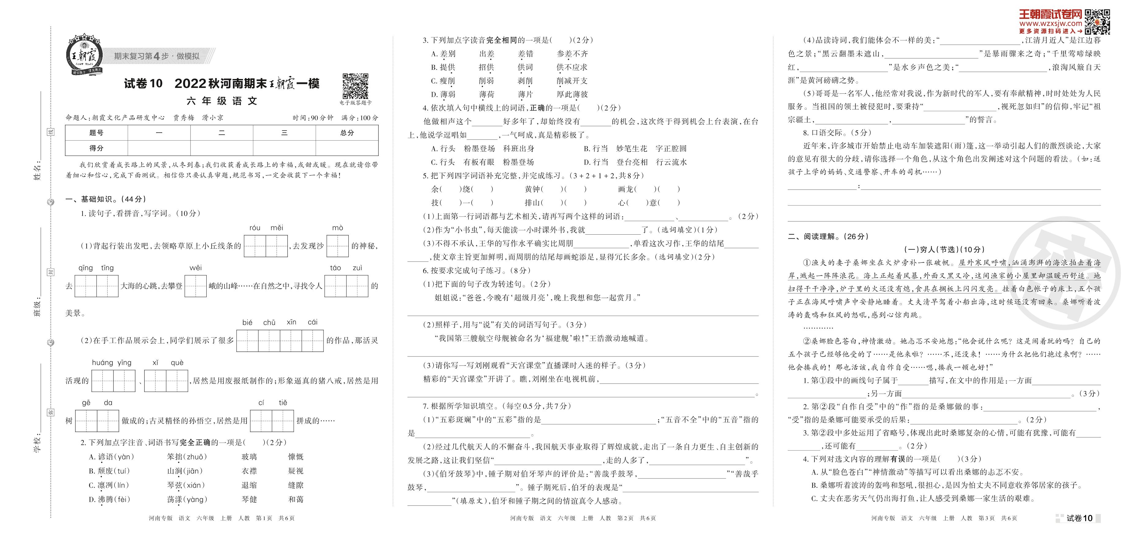 王朝霞期末模拟卷六年级上册语文(人教版)_R221111165630709【10】
