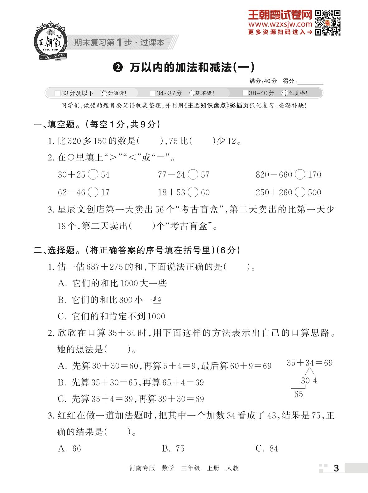 王朝霞期末过课本——2 万以内的加法和减法(一)三年级上册数学(人教版)