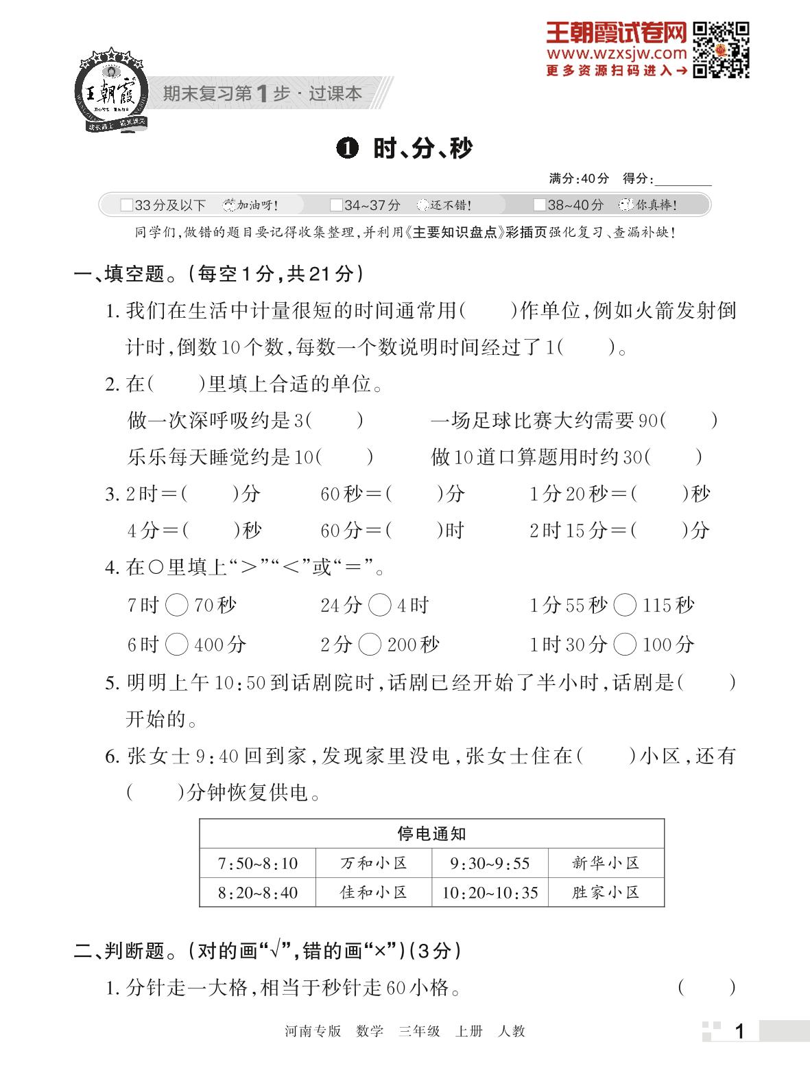 王朝霞期末过课本——1 时、分、秒三年级上册数学(人教版)