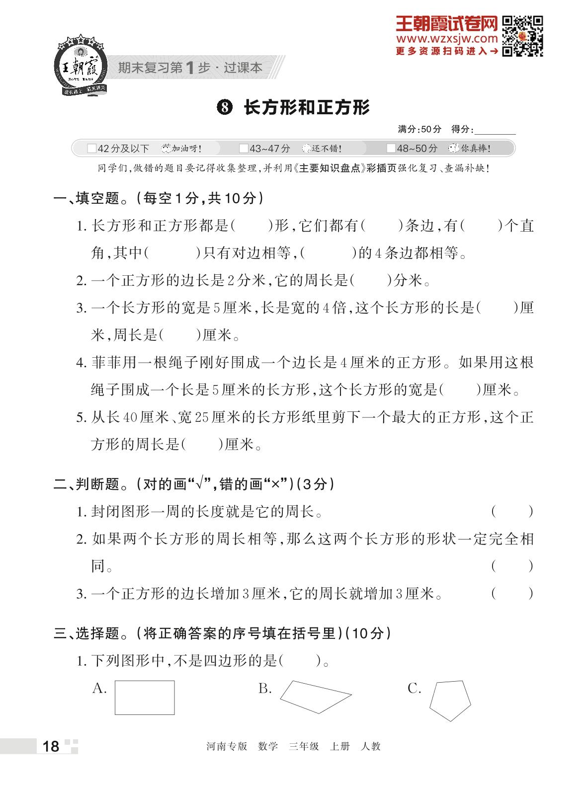 王朝霞期末过课本——8 长方形和正方形三年级上册数学(人教版)
