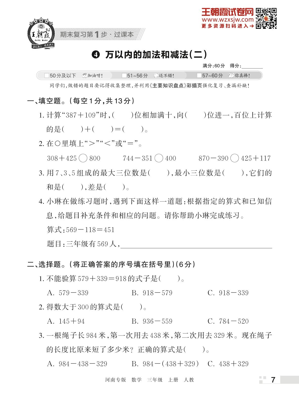 王朝霞期末过课本——4 万以内的加法和减法(二)三年级上册数学(人教版)