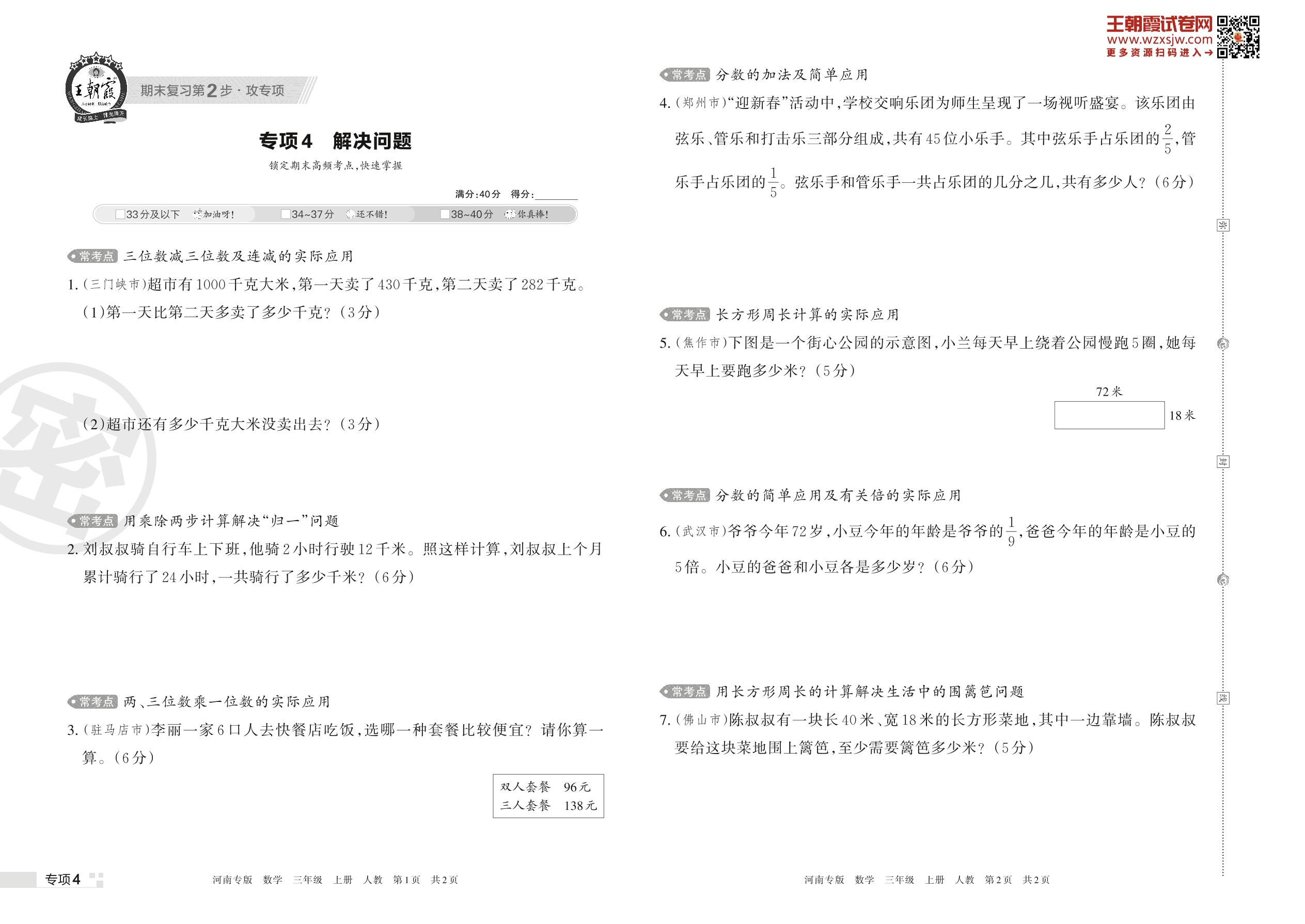 王朝霞期末专项卷——解决问题三年级上册数学(人教版)【4】